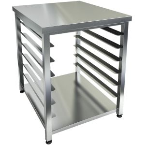 Подставка под печь ISTOMA MINI, ножки - профиль, изготовлено из нержавеющей стали, сварная конструкция, столешница усилена, сплошная полка. Имеет 6 пар направляющих под гастроёмкости GN1/1 с шагом 110 мм.