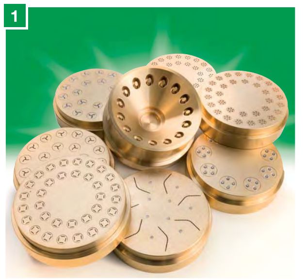 1. Формы для экструдирования макаронных изделий. Формы (матрицы) можно приобрести либо бронзовые матрицы (получаются макароны с более шершавой поверхностью), либо тефлоновые матрицы (получаются макароны с более гладкой поверхностью).