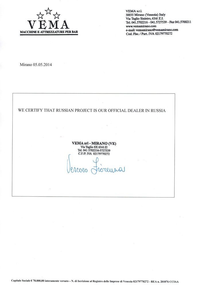 «Русский Проект» ® - Официальный дилер Vema на территории РоссииОбщая информация о компанииИтальянская компания Vema специализируется на производстве машин и высококачественного профессионального оборудования для баров, ресторанов, кафе и других предприятий общественного питания. Компания Vema сегодня предлагает рынку профессионального оборудования для предприятий общественного питания блендеры, соковыжималки, диспенсеры горячих напитков (аппараты для приготовления горячего шоколада), барные комбайны, аппараты для приготовления ледяной крошки (измельчители льда), профессиональные тостеры и яйцеварки, которые широко известны во всем мире и пользуются заслуженной популярностью в России. За 33 года работы компании стало очевидным, что техника Vema действительно служит долго и практически никогда не выходит из строя. В производстве продукции компании Vema используются только лучшие современные технологии и комплектующие, отвечающие всем стандартам качества и безопасности. Производимые машины предназначены для долгосрочного использования и практически не требуют затрат на установку и обслуживание. Невысокая цена, простота в эксплуатации, высокое качество и безопасность использования - вот характерные черты, отличающие оборудование Vema от оборудования других производителей. Оборудование VemaНа сегодняшний день все самые вкусные новинки и рецепты напитков со всего мира быстро становятся постоянным ассортиментом кафе и ресторанов, а также вполне доступны для изготовления в домашних. Свежевыжатый натуральный сок из экзотических фруктов, горячий шоколад, самые разнообразные кофейные или молочные коктейли - все это становится реальностью благодаря оборудованию Vema, компании, которая уже долгое время держит передовые позиции в сфере оборудования для приготовления напитков. Соковыжималки, миксеры и блендеры Vema изготовляются с применением самых современных технологий, а выбор моделей, их габаритные размеры, мощность и материал позволят подобрать оптимальное решение, которое будет отвечать любым требованиям клиента. Стильное и высокопрофессиональное оборудование впишется в любой интерьер. Барная стойка, современная кухня, кофейня или ресторан - продукция Vema смотрится органично в любой обстановке. Итальянцы знают толк как в напитках, так и в необходимой для их изготовления технике, поэтому качество и надежность оборудования не заставят желать лучшего. Горячий шоколад - лакомство, у которого много неравнодушных поклонников, но традиционное приготовление может занять немало времени. Поэтому компания Vema предлагает высококлассный аппарат для приготовления горячего шоколада, который отличается простотой и комфортом эксплуатации и обеспечит отличный вкус и качество напитка. На каком бы продукте Вы не остановили свой выбор, оборудование Vema Вас не разочарует и гарантирует долгую службу, не требуя какого-либо ремонта или периодической замены деталей. Блендеры