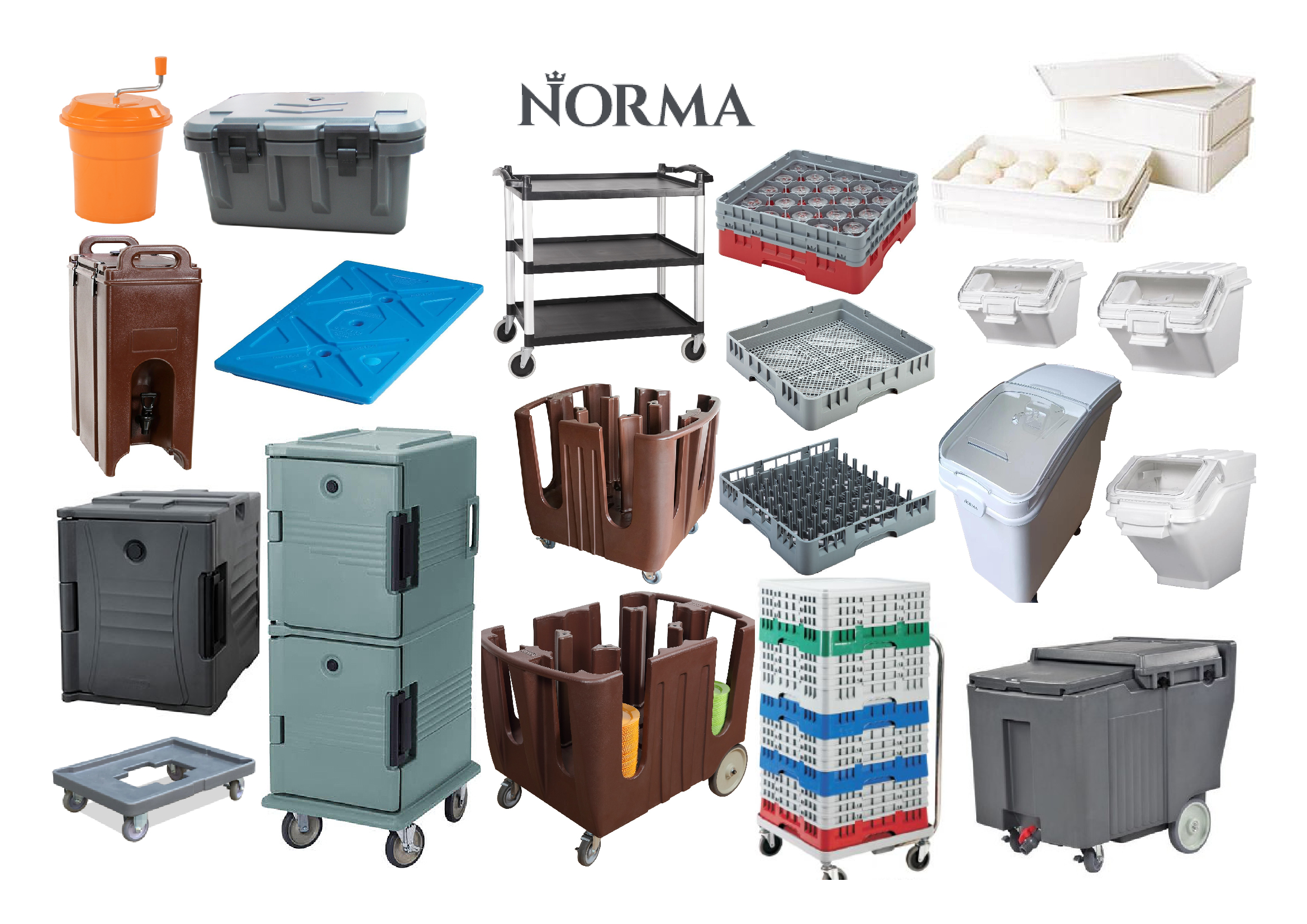 Для сохранения и перевозки продуктов, готовых блюд и напитков - термоконтейнеры NORMA с верхней и боковой загрузкой, тележки к ним, а также холодильный элемент для перевозки замороженных продуктов.
