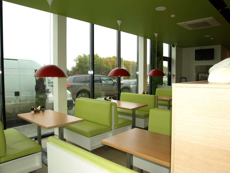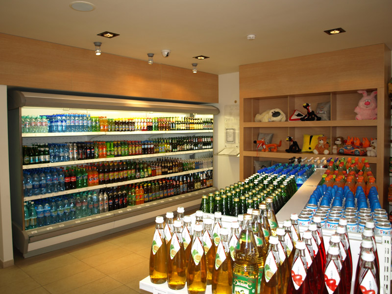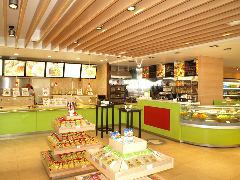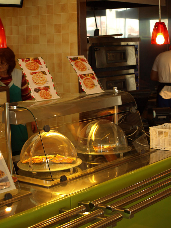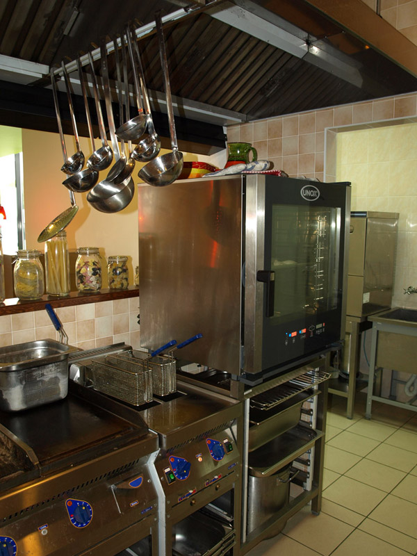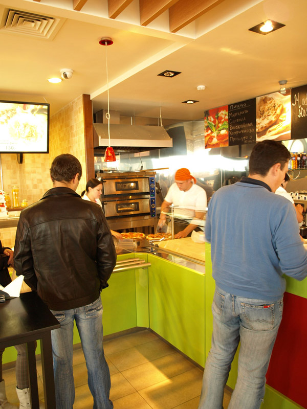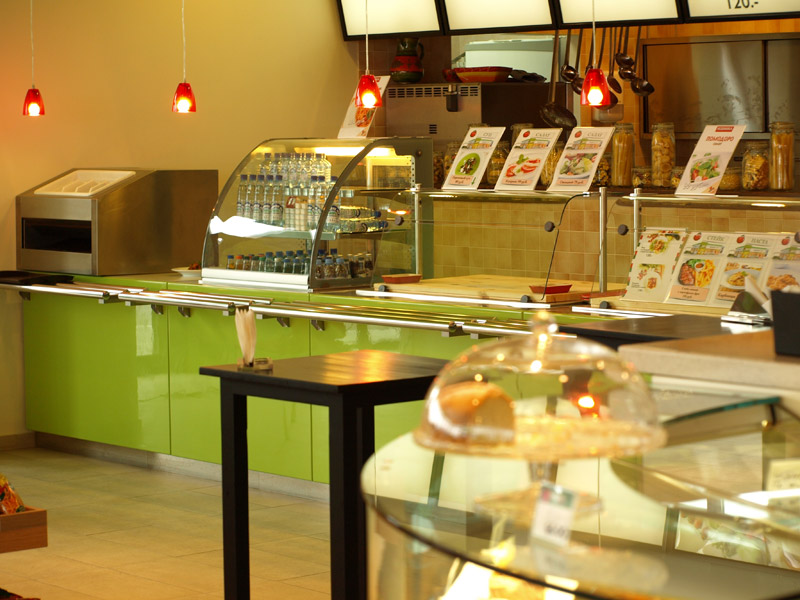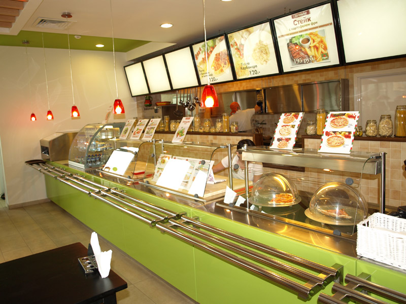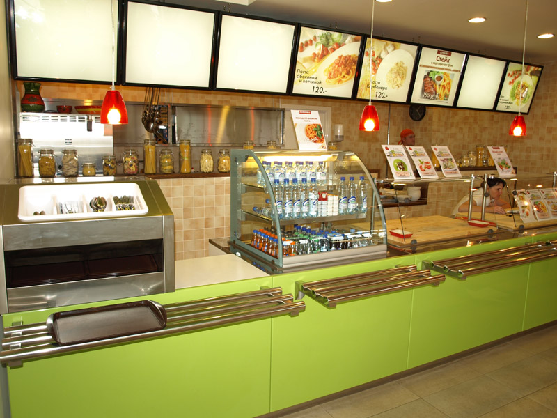 Оборудование: Встроенные элементы линии раздачи Emainox (Италия), кондитерская витрина IFI (Италия), тепловая линия Чувашторгтехника, пароконвектомат Unox, печь для пиццы MEC (Италия), нейтральное оборудование Iterma (Россия). Холодильная горка Magma (Россия), минигорка Carrier (Германия), шкафы и холодильные камеры Ариада (Россия), холодильный выносной агрегат НСК в шумоизоляционном корпусе. |