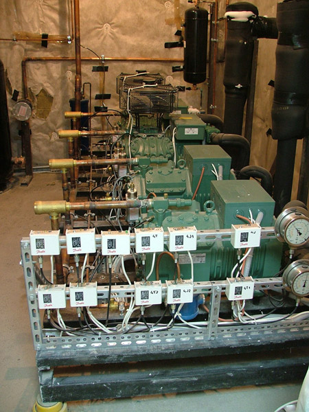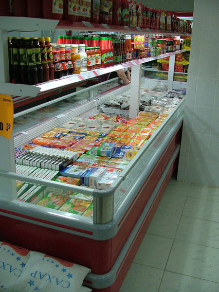 Супермаркет с площадью торгового зала 500 м2, Складские, подсобные помещения, холодильные камеры размещены в подвале. Агрегатная часть в подвале, выносной сверхмалошумный конденсатор на улице. Все холодильное оборудование работает от централизованного холодоснабжения.