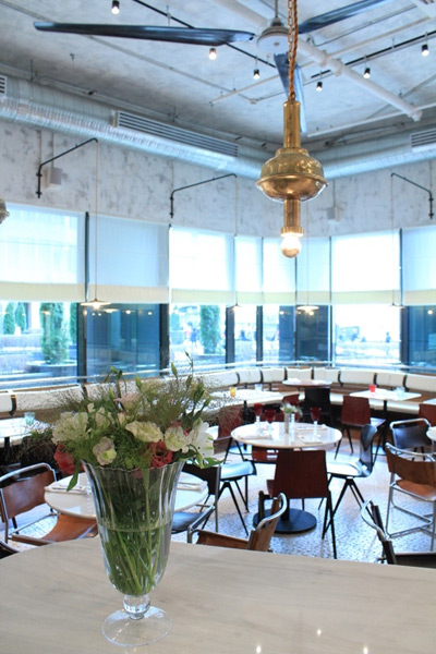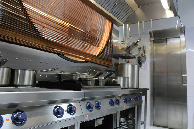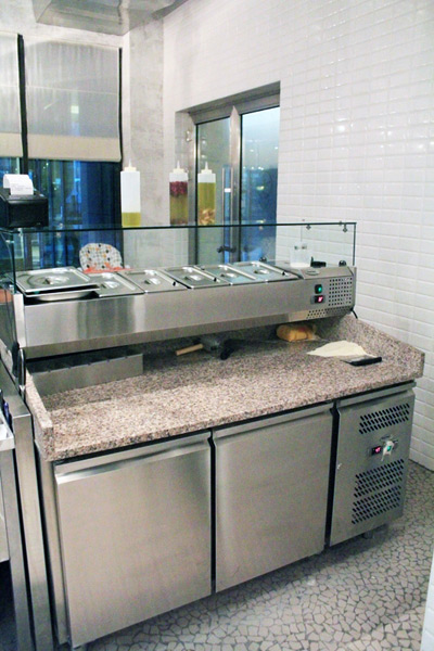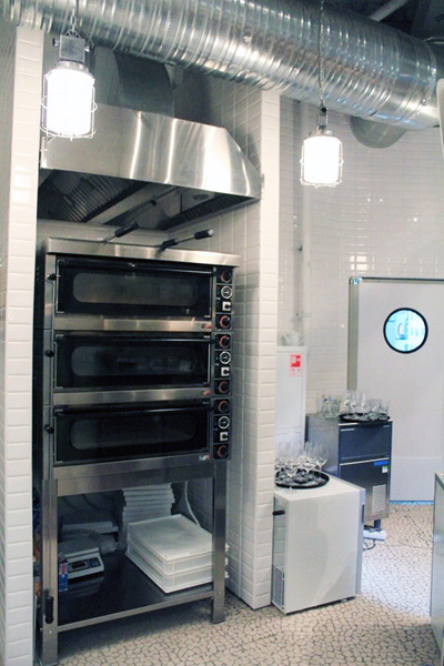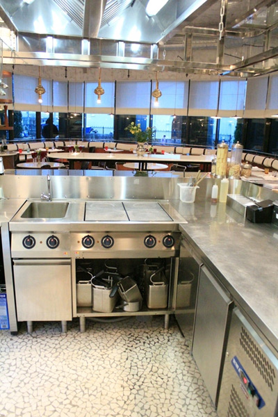 В ресторане две кухни: пиццу и пасту готовят в открытой кухне, расположенной за барной стойкой, а основная часть меню рождается в традиционной закрытой кухне, которая, впрочем, тоже частично открыта взору посетителей благодаря большому иллюминатору.