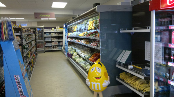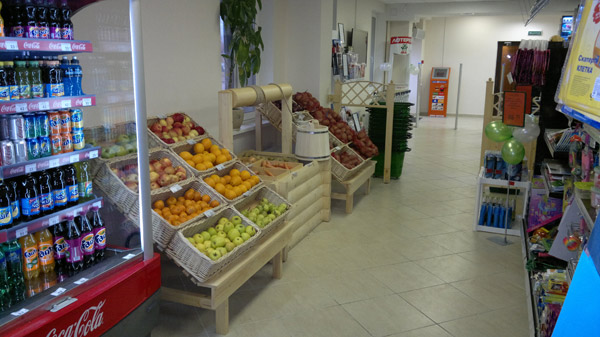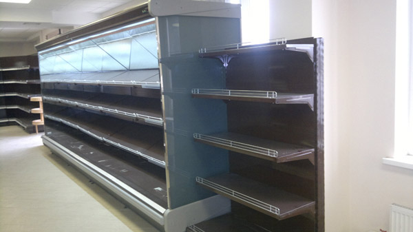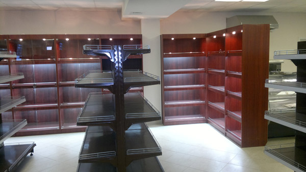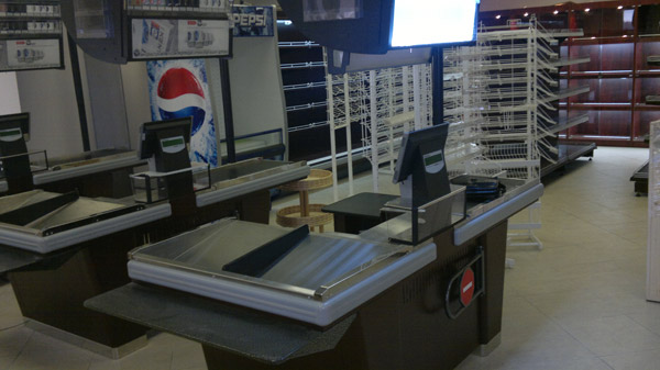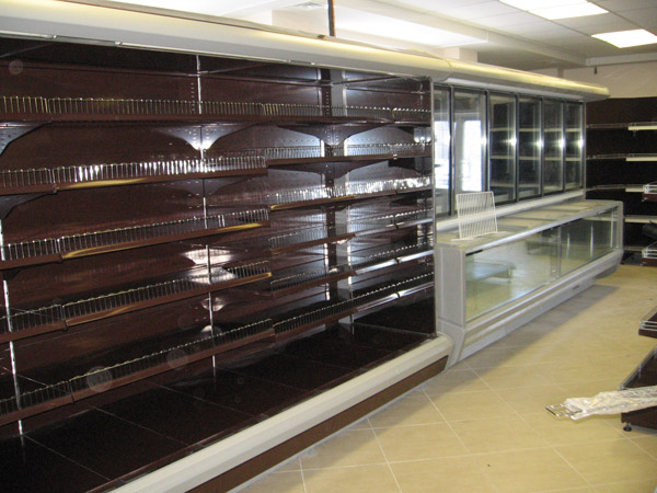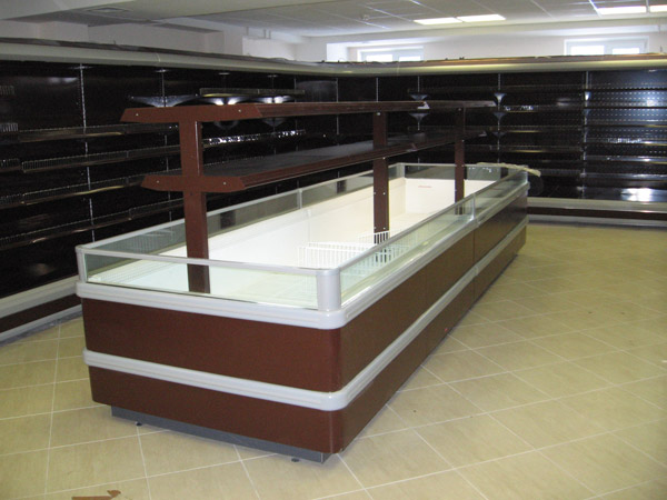 Все торговое оборудование выполнено под заказ в нестандартном, темно-коричневом цвете. Пристенные горки включают в себя угловой охлаждаемый модуль. Это более рациональная организация торгового пространства, увеличивающая торговую площадь для выкладки товара.