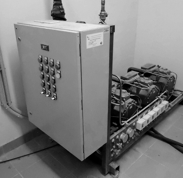 Все холодильное оборудование работает от централизованного холодоснабжения. Центральная холодильная машина размещена в подвале. Малошумные конденсаторы вынесены на улицу.
