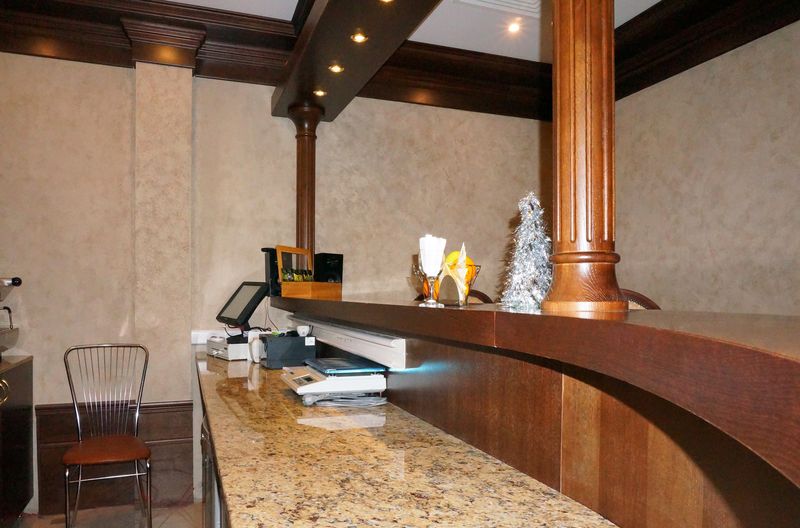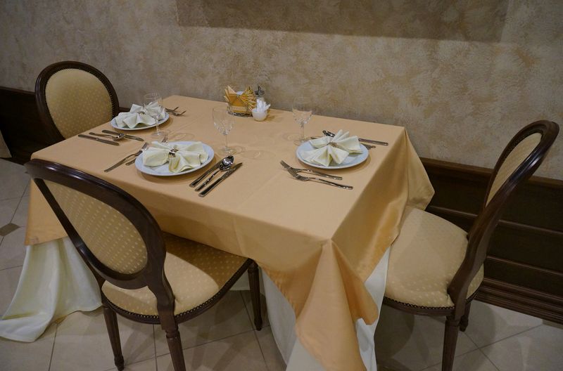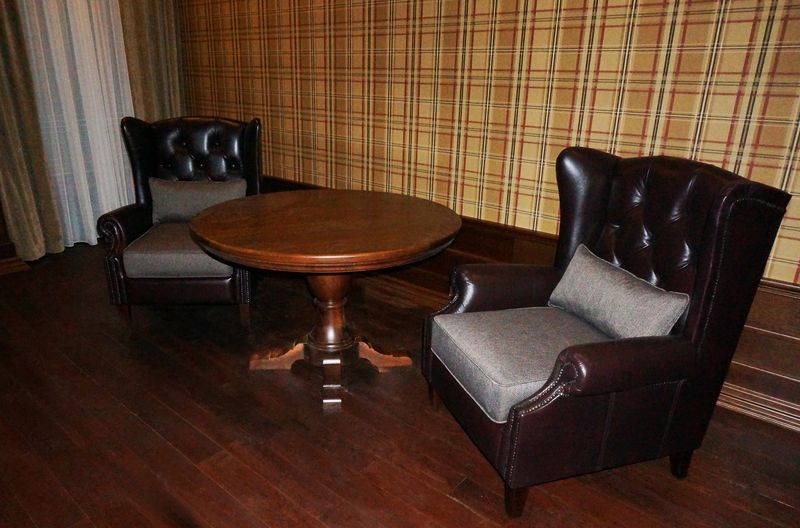 Особую атмосферу столовой придает мебель. Высокое качество исполнения в сочетании с изысканным дизайном присутствует даже в мелочах. В зале расположены дубовые обеденные столы на массивных опорах и классические ресторанные стулья в обивке из итальянского жаккарда. Все декоративные элементы, присутствующие на мебели, выполнены вручную. В дизайне преобладает неизменная классика и ретро-стиль.
