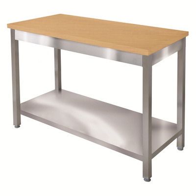 Полка изготовлена из нержавеющей стали AISI430, столешница — бук; ножки регулируются по высоте. |