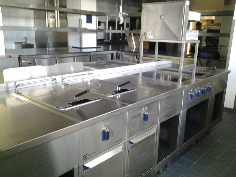 Чтобы приготовить фарш и для переработки овощей, на кухне ресторана была установлена мясорубка Electrolux. С помощью мясорубки также можно измельчить сыр и орехи. Были также вмонтированы стол-вставка, стенд открытый и стол тепловой от Electrolux.