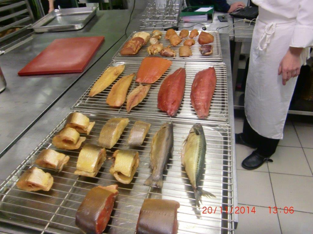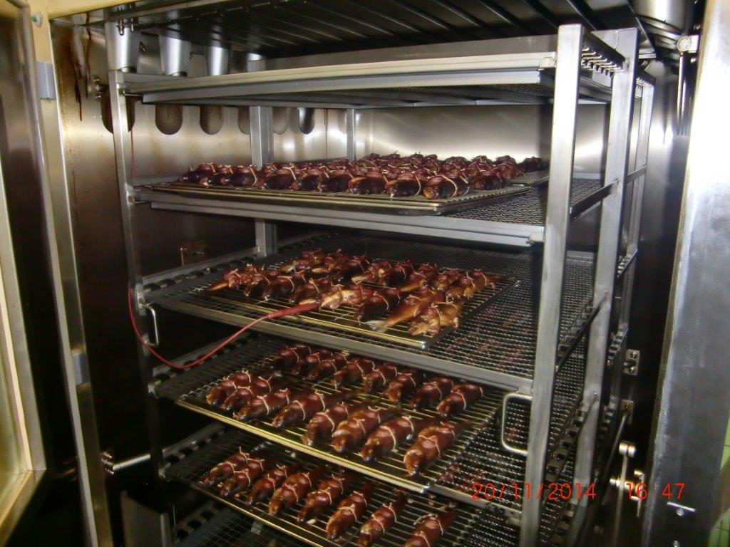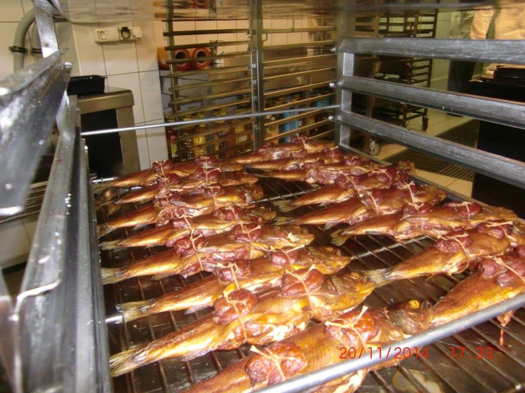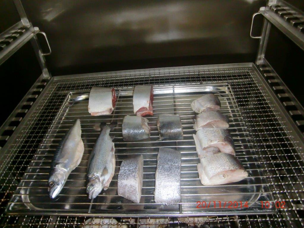 Коптильная камера размещена в горячем цеху предприятия. Заготовленные для копчения продукты подвозятся на тележках из заготовочных цехов. Ассортимент продукции включает в себя птицу (цыпленок, утка, индейка), колбасную продукцию высокого качества, морскую и речную рыбу, при этом нежирную рыбу (дорада, сибас и др.) подвергают горячему копчению, а жирную (черный палтус, муксун, нерка, омуль и др.) – холодному. При горячем копчении продукты обрабатывают горячим дымом 50-80 °С, при холодном соответственно холодным 20°С. И если для первого достаточно 1-2 часа, то для второго требуется 4-5 часов. Для коптильной камеры LEFA TSFR 100 загрузка тележки в среднем 150 – 200 кг для мяса и 100 – 150 кг для рыбы. То есть за смену 8 часов производительность составит до 1т мяса при горячем копчении и 300 кг для рыбы холодного копчения. Для копчения была выбрана щепа бука фракцией 1-2мм (получившая наибольшее распространение и признание в Европе).