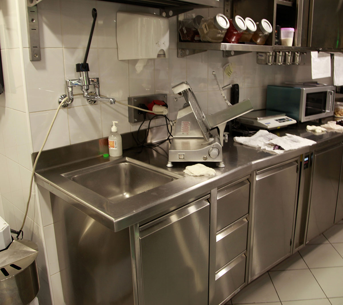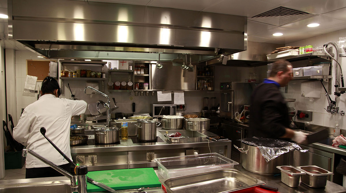 Основная кухня находится этажом ниже. В дооснащении именно этого помещения принимали участие специалисты компании «Русский Проект»®. Технологическое оборудование представлено двумя известными компаниями на рынке профессионального оборудования — это Hoshizaki (Япония) и SIRMAN (Италия).