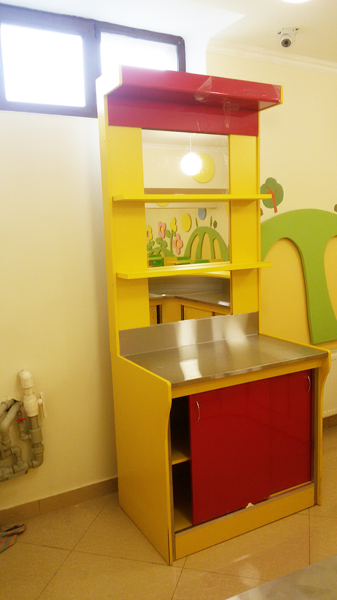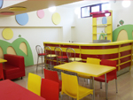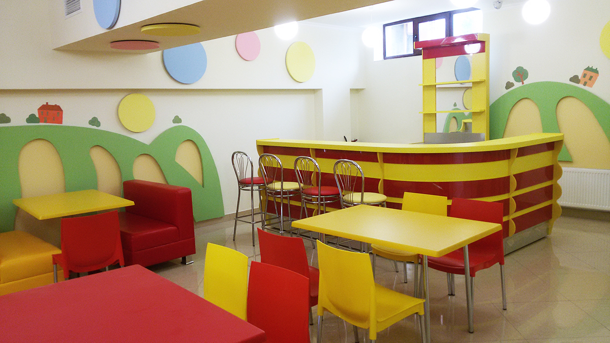Атмосферу радостного и красивого детского кафе в развлекательном центре г. Владикавказа, мы создали при помощи сочетания ярких цветов, а также игрой фактур. Глянцевые и матовые поверхности на барной стойке поддерживаются в мягкой мебели и стульях, создавая интересный колорит заведения. Сочетания разных форм и фактур важно для развития маленьких посетителей.