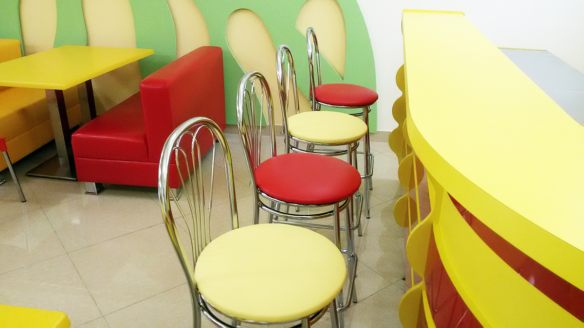 Мы также позаботились и о функциональности кафе. Столешницы выполнены из Топалита - материала, устойчивого к царапинам и сколам. Пластиковые стулья из полеуретана с применением современных технологий, позволяющих интенсивную эксплуатацию. Обивка диванов - водонепроницаемый кожзаменитель.