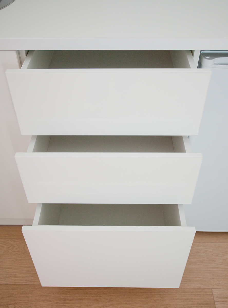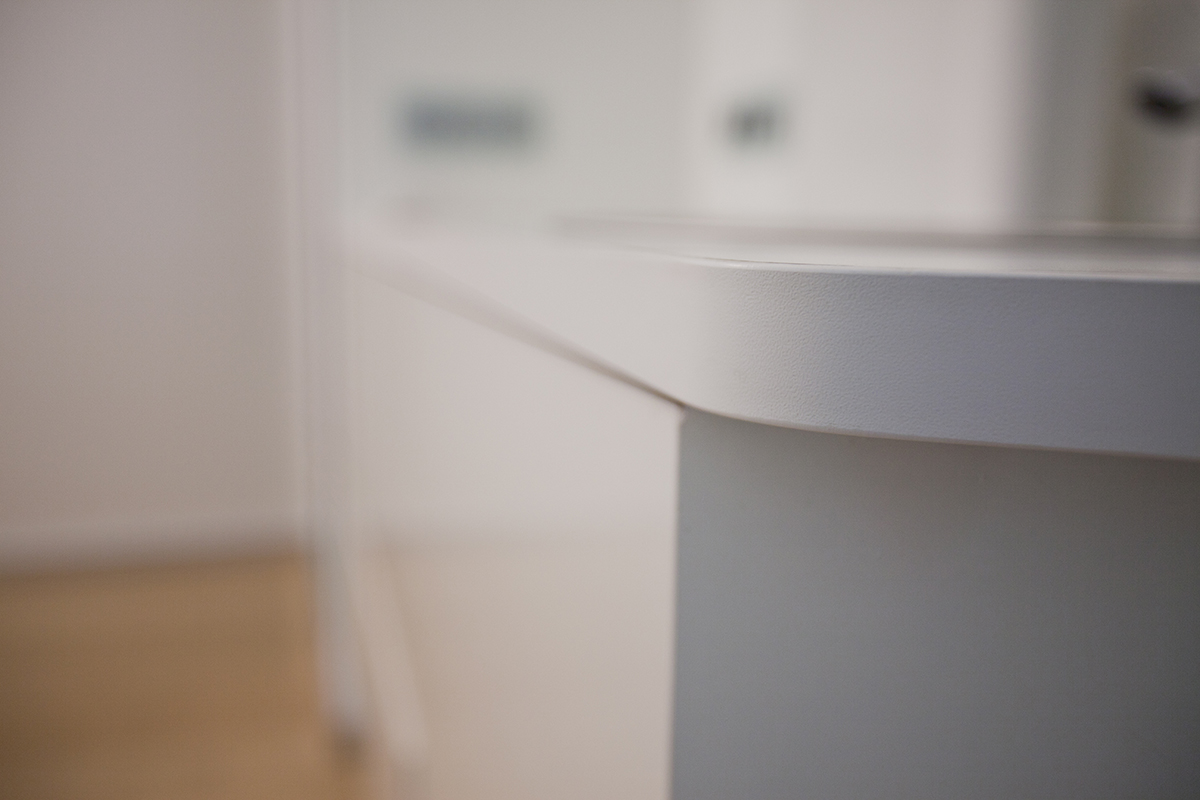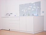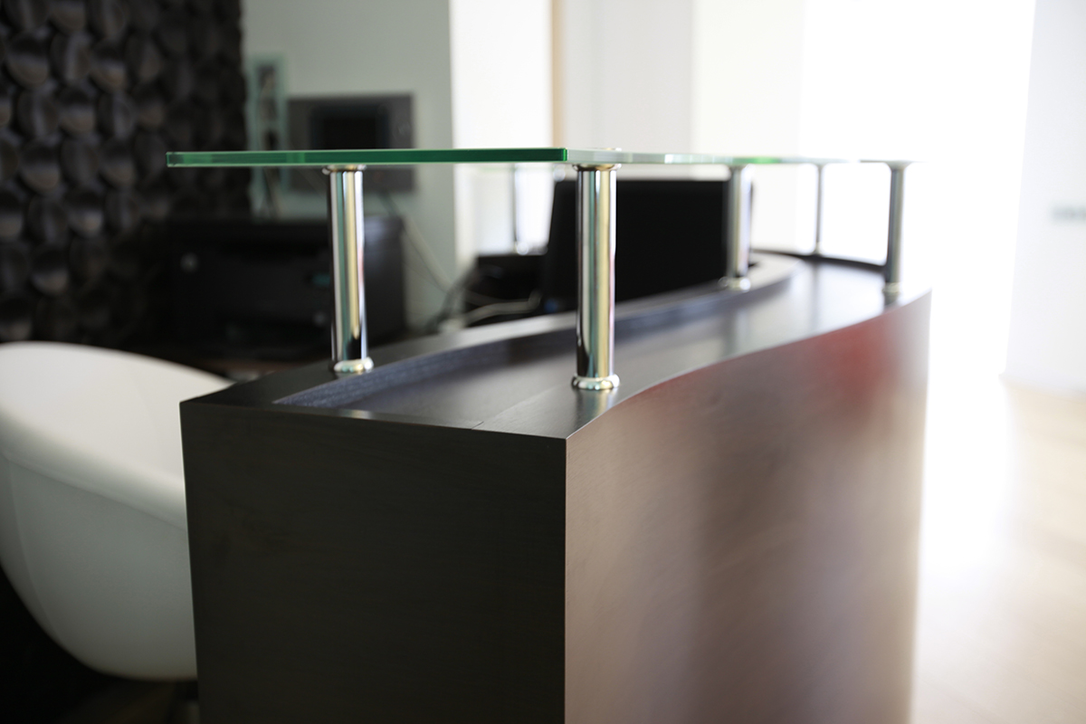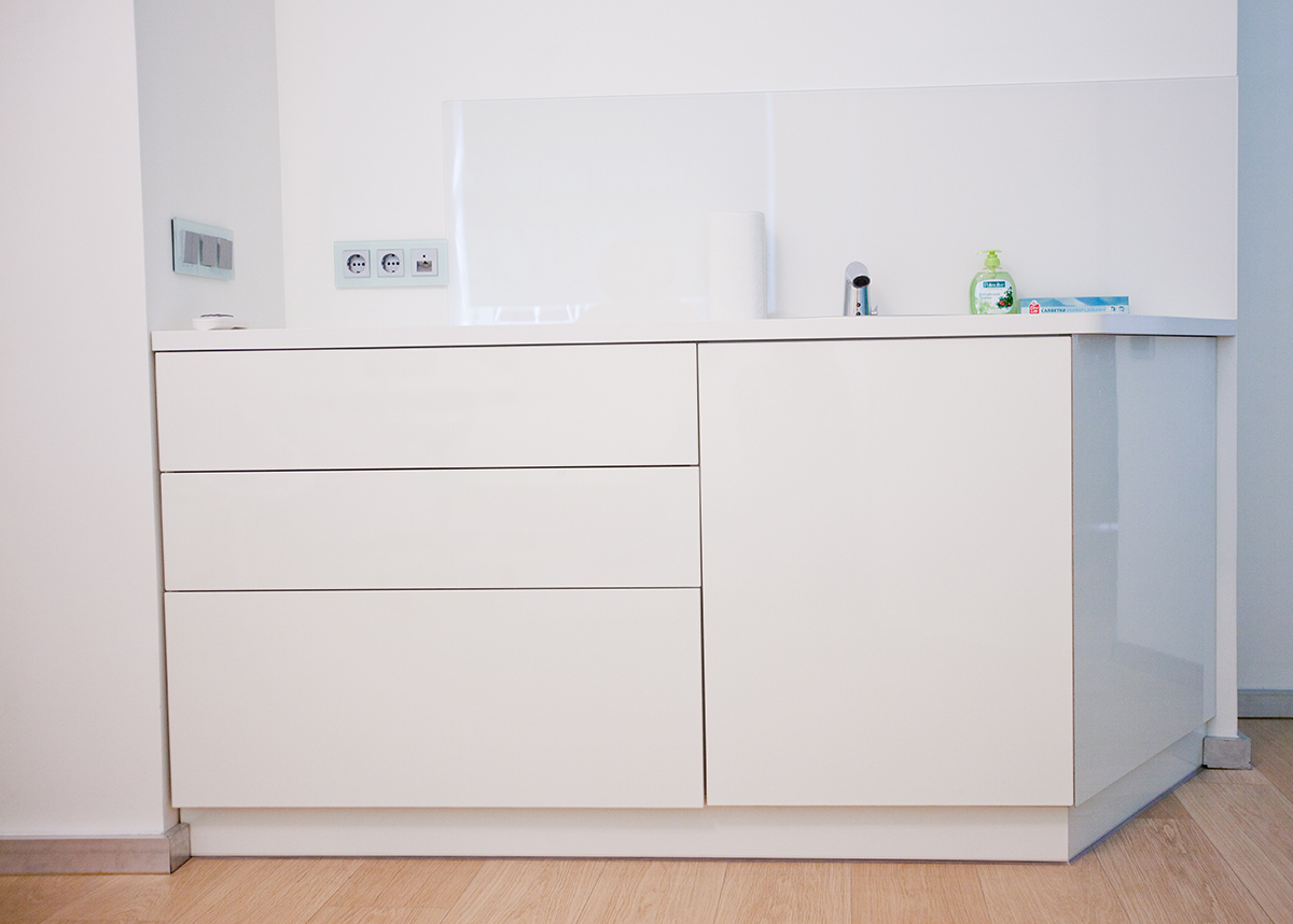 Глянцевые белоснежные шкафы с системой открывания push-pull, четко-выверенные пропорции, чистые линии мебели настраивают мастера на работу и подчеркивают общий стиль помещения. Стойка ресепшн является ключевым дизайнерским объектом, лаконично связывая стеклянные перегородки и стену с декоративными элементами, напоминающими кофейные зерна, предлагая клиентам клиники расслабиться и погрузиться в мир прекрасного.