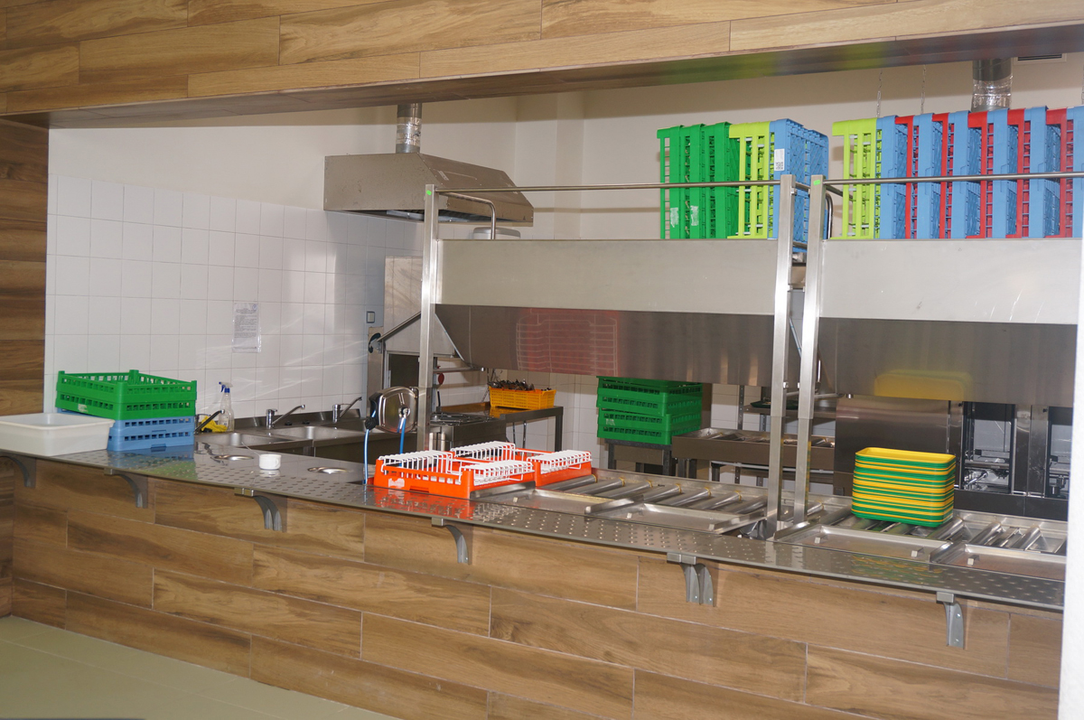 Уникальность объекта заключается в реализации элемента самообслуживания для школьников. По проекту, учащиеся после приема пищи сами должны убрать остатки с посуды, после чего рассортировать грязную посуду по кассетам. Специалистами компании «Русский Проект»® была подобрана и поставлена туннельная посудомоечная машина COMENDA AC2EP9 с дозаторами, сушкой и рекуператором. Инженерами фабрики Итерма были разработаны специально для этой машины сортировочные столы с конвейерной системой.
