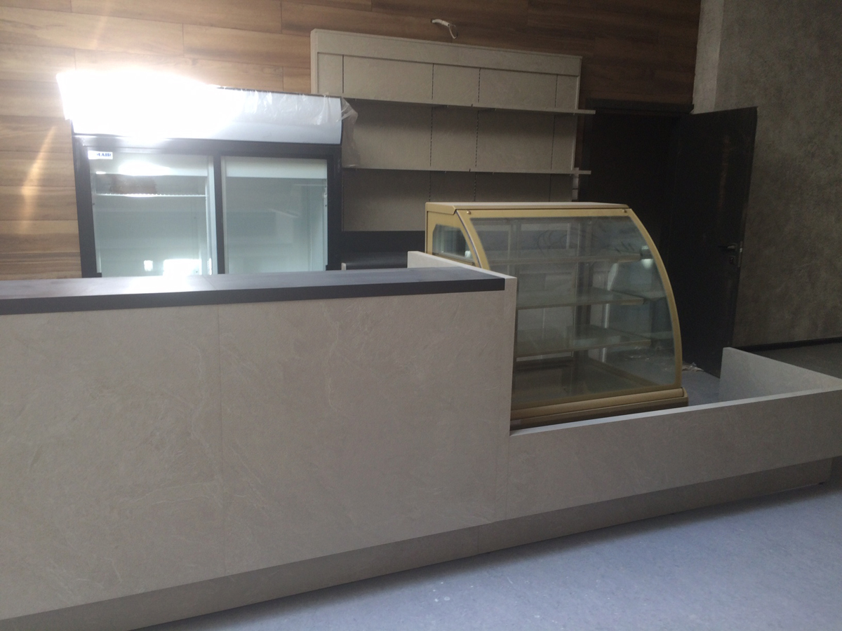 По дизайн-проекту заказчика в столовую была изготовлена барная стойка: угловая, 5,5 м погонных. С пристенным модулем. Выполнена из материалов фирмы Эггер - ЛДСП и пластика. Кроме того, разноцветные столы, стулья и пуфы, выполнены по индивидуальному дизайну, обивка - эко-кожа, цвета салатовый и темно-серый.
