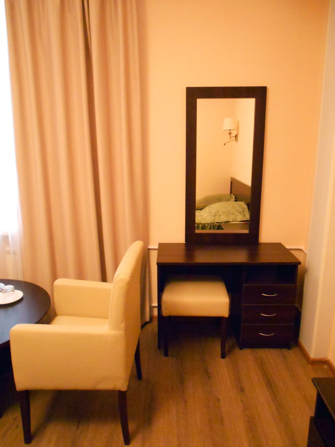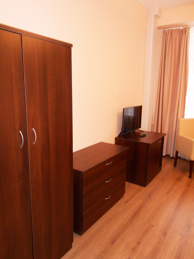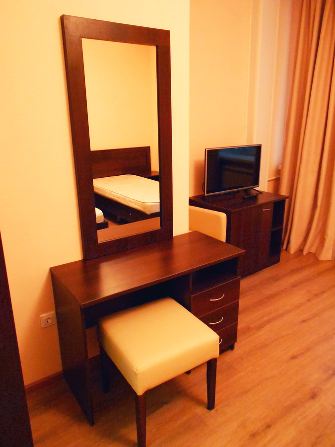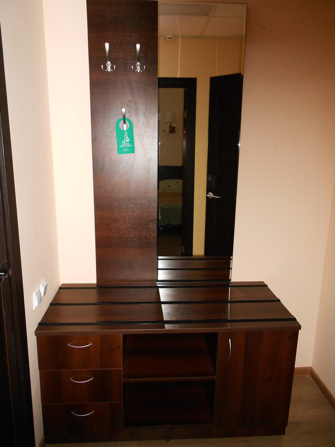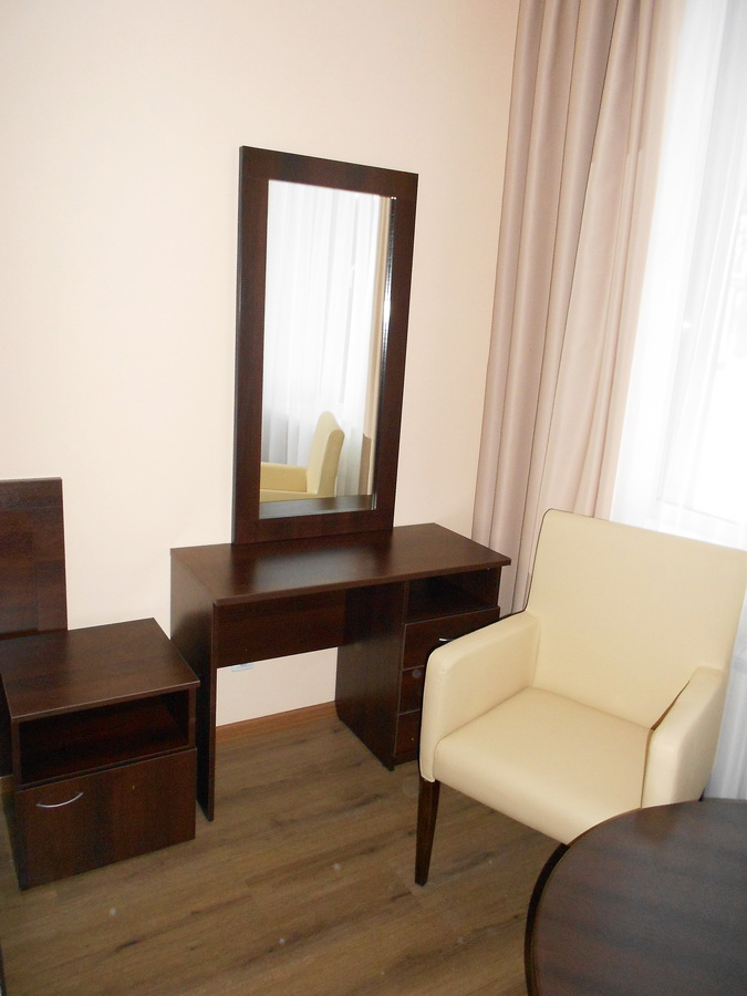 Двуспальные и односпальные кровати с изголовьями, прикроватные тумбы ЛДСП, шкафы двустворчатые ЛДСП, тумбы под минибар ЛДСП, багажницы ЛДС, журнальные столики ЛДСП, зеркала ЛДСП, пластик, Производство T&T (Россия).