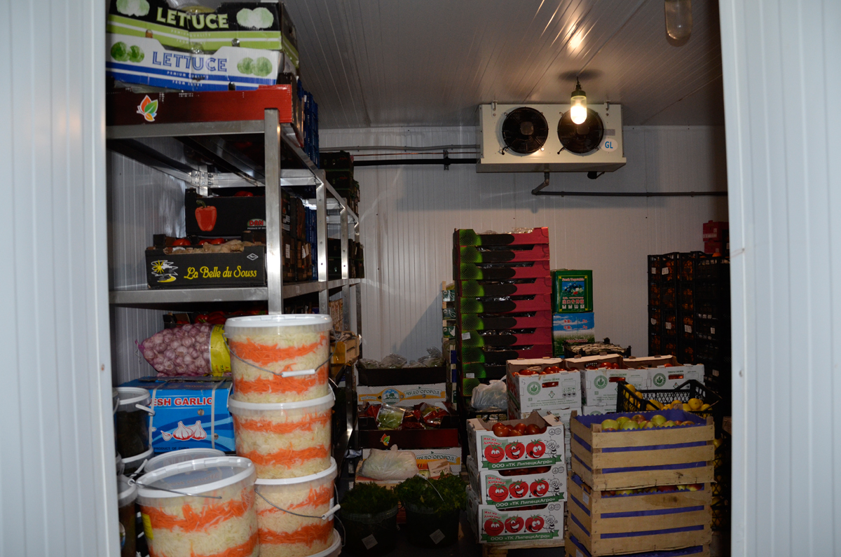 Специалистами компании был разработан проект по холодообеспечению 3-х среднетемпературных и 2-х низкотемпературных камер на независимых центральных холодильных машинах на базе компрессоров Copeland (США). Установлены откидные мосты и док-шелтер DOORHAN для облегчения пополнения запасов продовольственного склада с грузовых автомобилей. Осуществлена сборка камер из ППУ панелей фирмы "Профхолод", установлены воздухоохладители, конденсаторы компактно смонтированы в машинном зале здания. Разработаны трассировки и пневмо гидравлические схемы фреоновых трубопроводов, грамотно смонтировано и запущено в работу. При разработке проекта, была тщательно продумана установка и доступ ко всему холодильному оборудованию, для последующего удобства обслуживания.