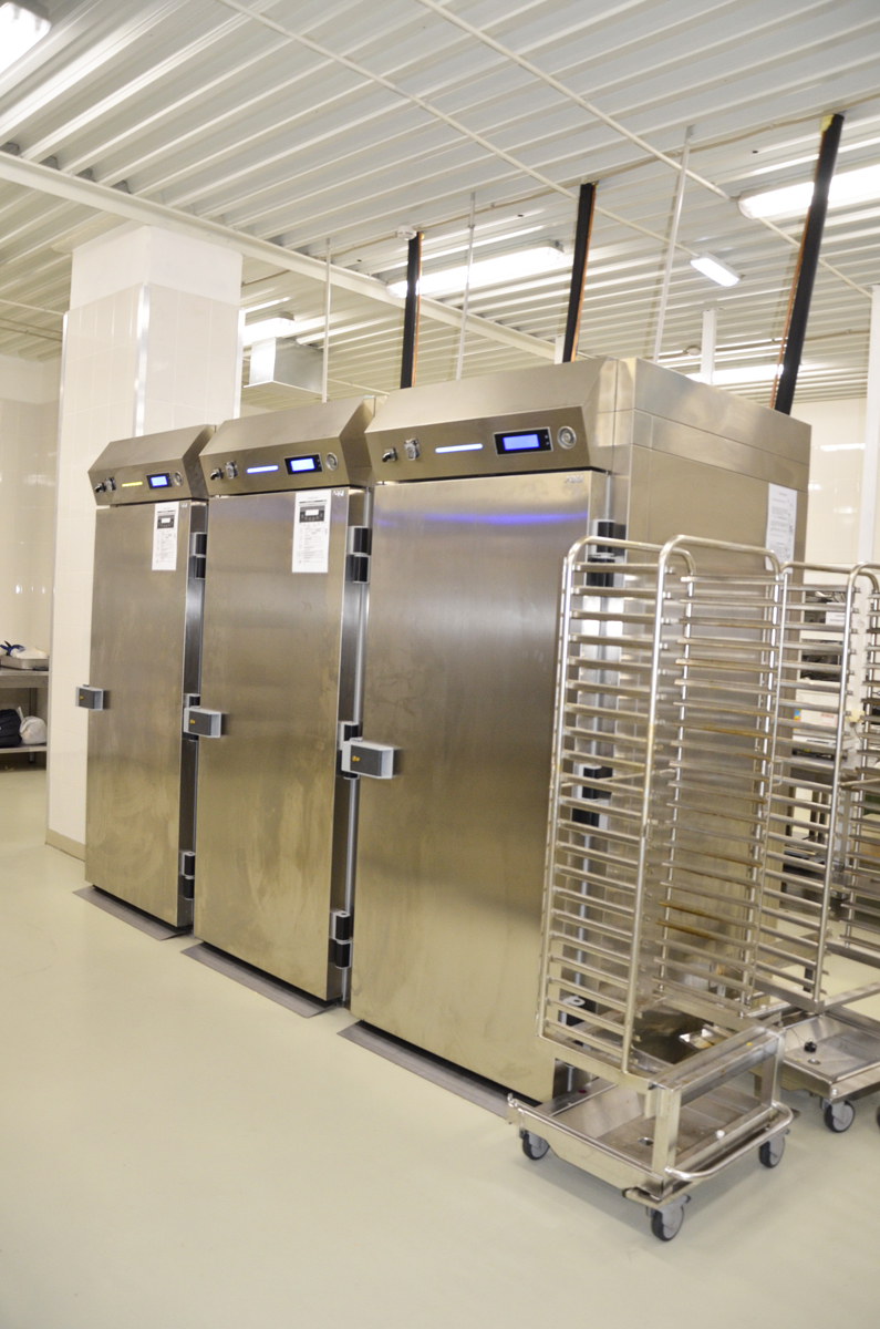В горячем цехе осуществляется тепловая обработка приготовленных полуфабрикатов. Отдельное внимание уделено индивидуальным заказам блюд кашрута и халяль. Установлена линия пароконвектоматов чешского производителя Retigo. За счет использования щадящих методов обработки продуктов: варка на пару, припускание, тушение, запекание, максимально сохраняются витамины и питательные вещества. Один из пароконвектоматов имеет функцию копчения.