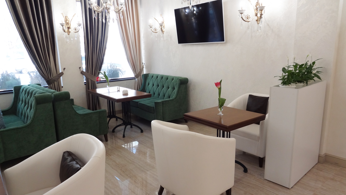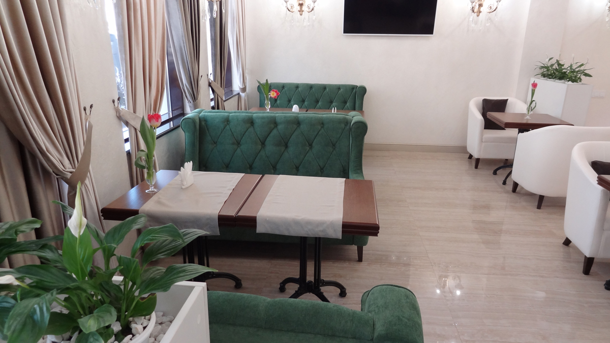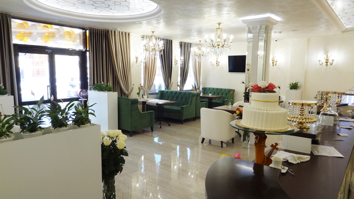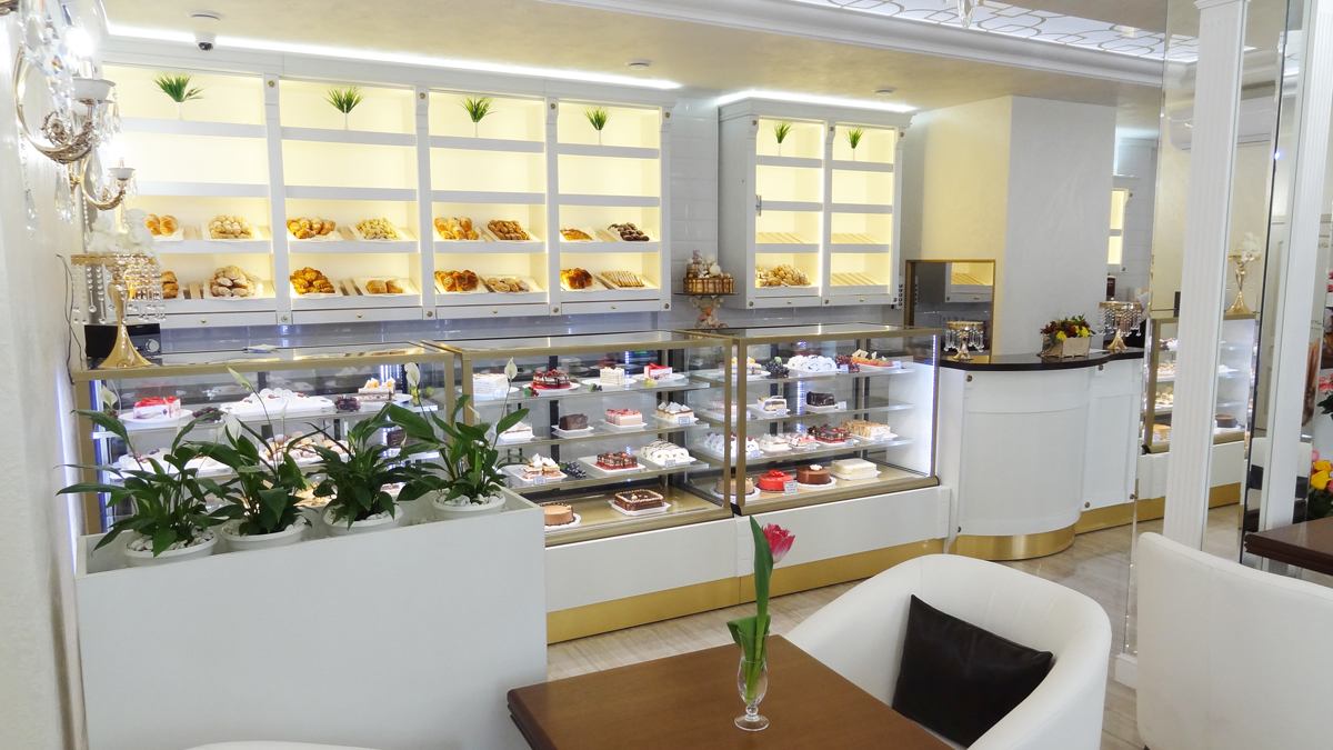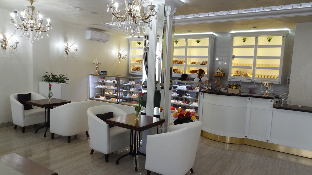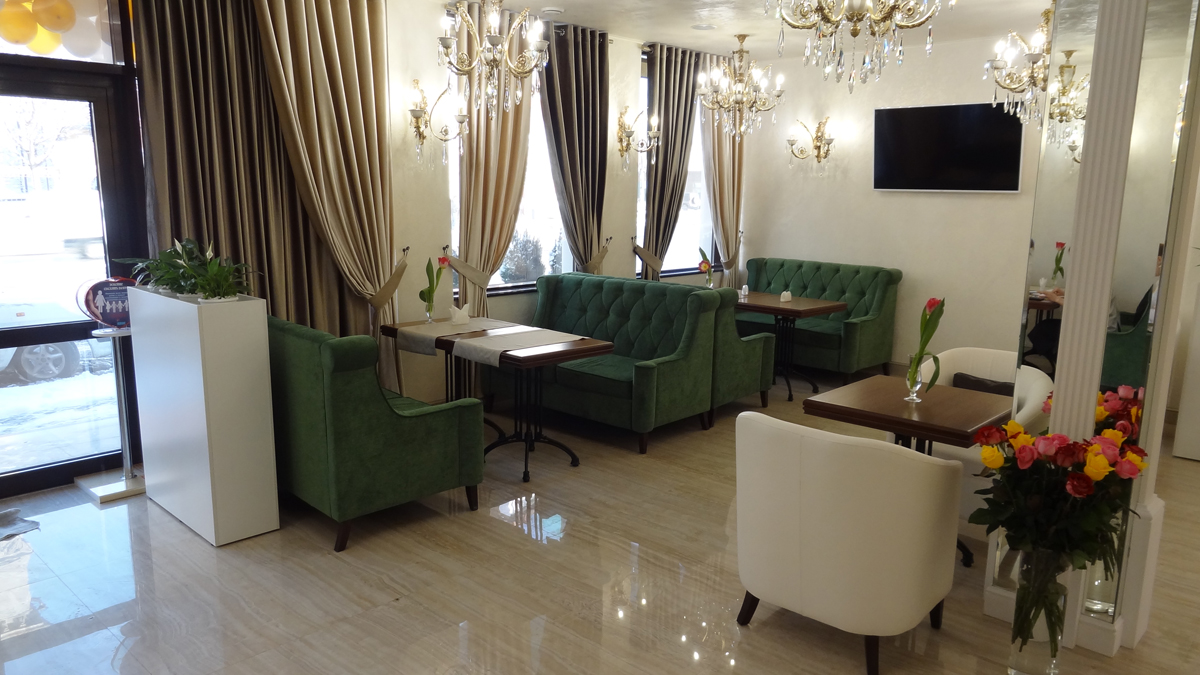 Идеальное решение для интерьера кондитерского дома — мебель T&T. Которая выполнена на сварном металлокаркасе, ЛДСП и белого пластика. Столешницы из искусственного камня, декоративные элементы из крашенного МДФ. Декоративная подсветка создает неповторимую волшебную атмосферу и уют в кафе «Анечка». Мягкая мебель из велюра и удобные кресла из качественной искусственной кожи. Игра цветового решения по текстилю выгодно подчеркивает снежно-белую барную стойку и венецианскую штукатурку на стенах.