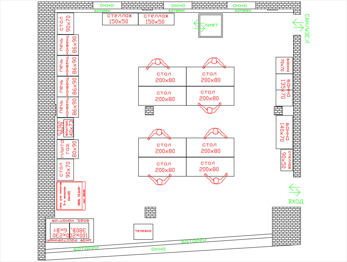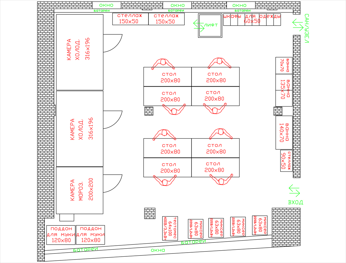 Компания «Русский Проект»® осуществила проектирование и поставку оборудования и мебели «под ключ». На первом этаже был сделан проект кафе-кондитерской, на втором и третьем - спроектированы два цеха: холодный и горячий. А также проведены сборочные и пусконаладочные работы.