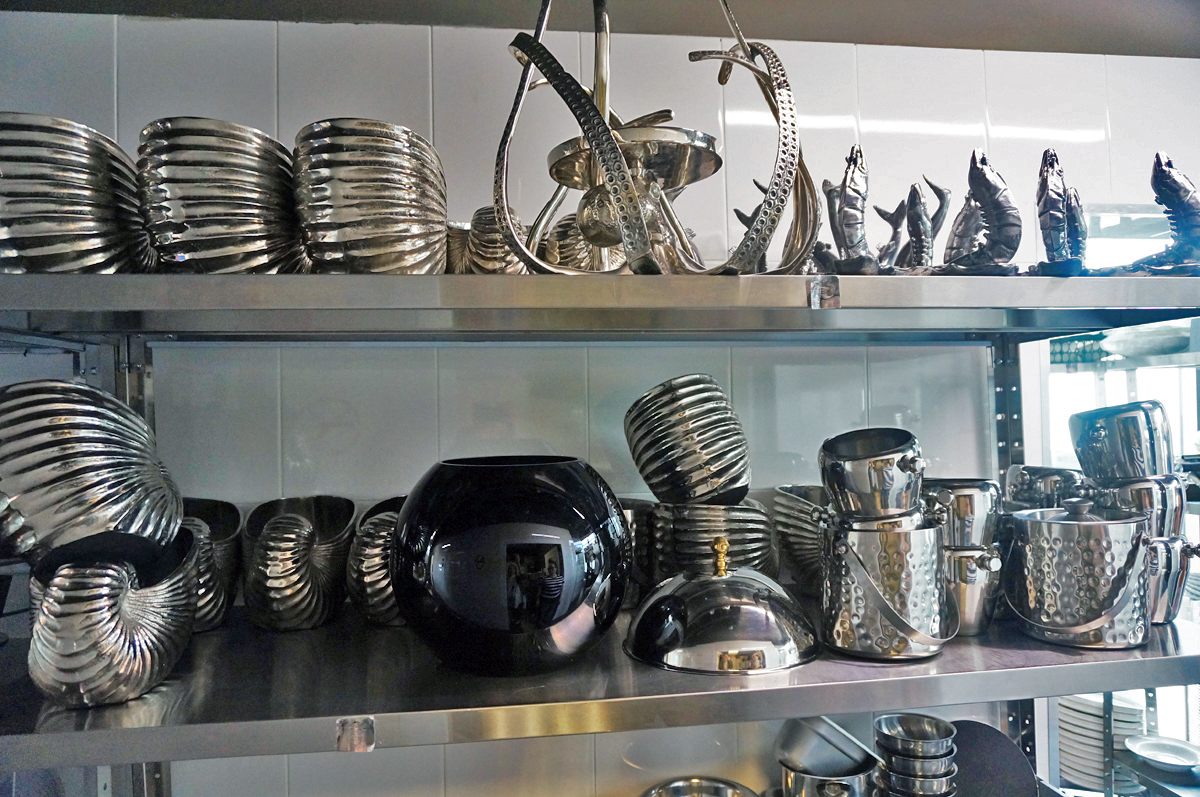 Кухня ресторана расположена в подвале (складские и заготовочные цеха) и на 22 этаже, связь между которыми обеспечивается лифтами. Конфигурация здания овальной формы с витринным остеклением определило уникальное проектное решение кухни. Отсутствие стен по периметру определило потолочное крепление многих элементов кухни и расположение тепловых островов в центре помещения. Три тепловых острова являются цельными конструкциями, каждый из которых продуман и спроектирован исходя из задач шеф повара и меню ресторана. Для решения данной задачи был выбран HEKO от производителя Emainox– компания, которая специализируется на разработке и производстве встроенных электрических индукционных кухонных приборов. Они отличаются высокой экономией энергии и низкими эксплуатационными расходами. Встроенные кухни и модули HEKO комфортны в использовании, выполнены из качественных материалов, обеспечивающих привлекательный внешний вид и высокую гигиену. Толщина стали, используемой для плит – 5 мм. Дополнительно, проектным решением, острова оборудованы нейтральными вставками для увеличения рабочей поверхности, которые можно откидывать или убирать по необходимости. Обязательным атрибутом горячего цеха являются пароконвектоматы RATIONAL, которые для экономии пространства, установлены друг на друга.