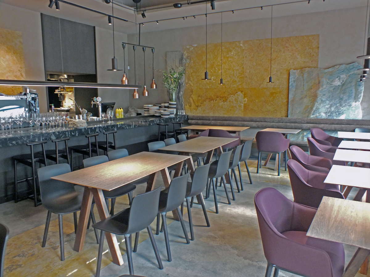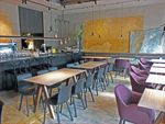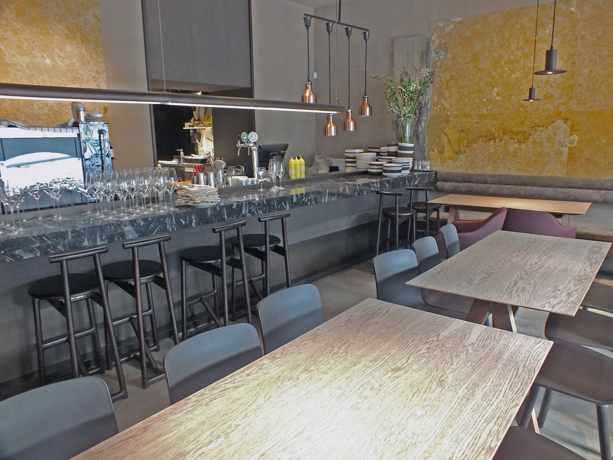 Барная зона оснащена следующим оборудованием: соковыжималка VEMA CE2047/ALL для твердых овощей и плодов, льдогенератор кубикового льда ICEMAKE ND 50 AS, блендер SIRMAN DRAGONE; для взбивания соусов, муссов, фруктовых, молочных и алкогольных коктейлей, кофемолка MACAP MC6 с регулировкой качества помола, шкаф винный TEFCOLD TFW160S на 45 бутылок.