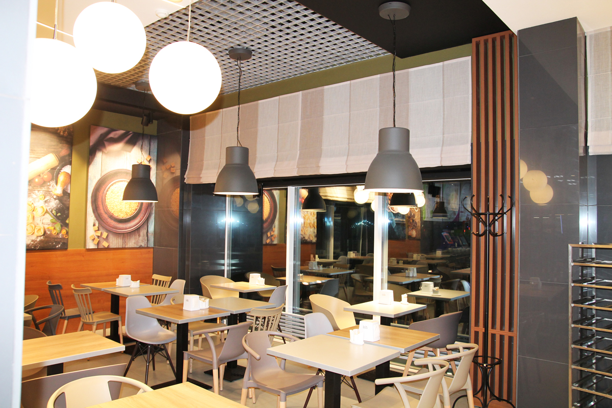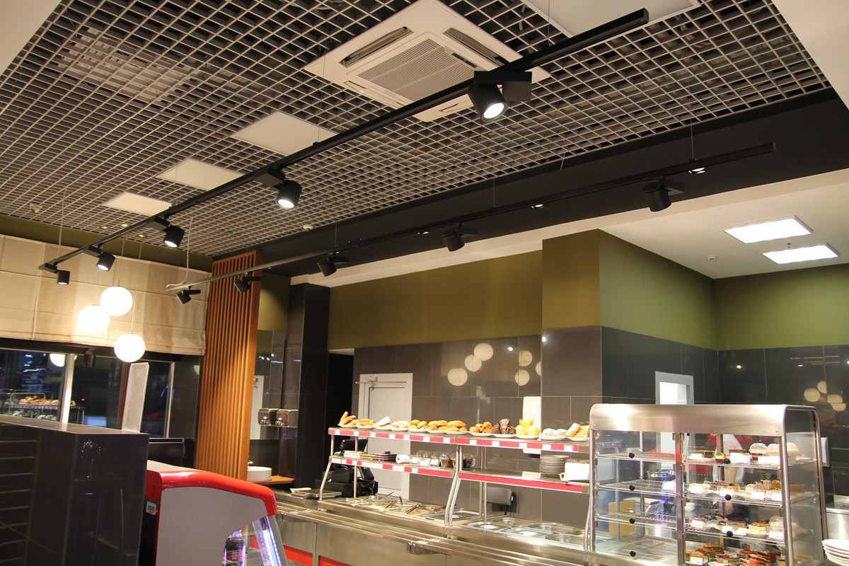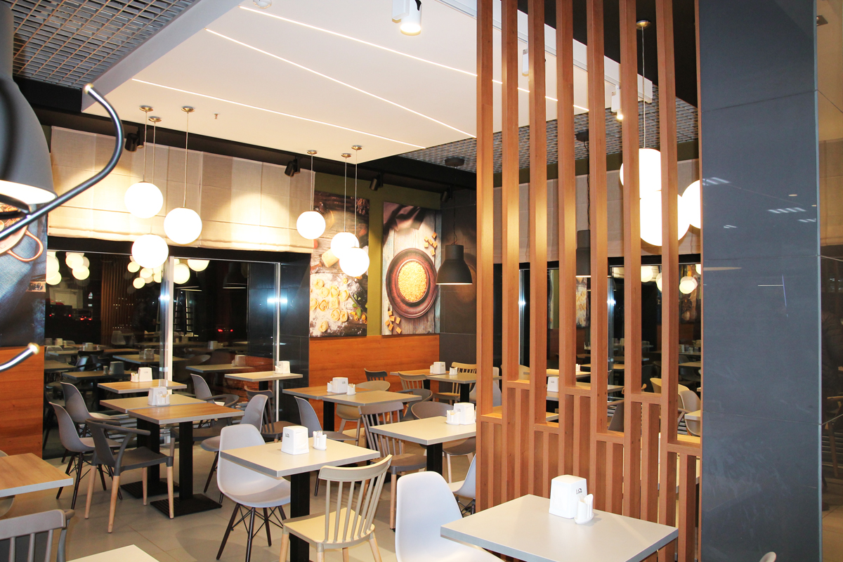 Так как это второе кафе такого формата, то был полностью сохранён дизайн, спроектировано и смонтировано акцентное освещение (прожекторы на шинопроводе) торговой марки Lival.