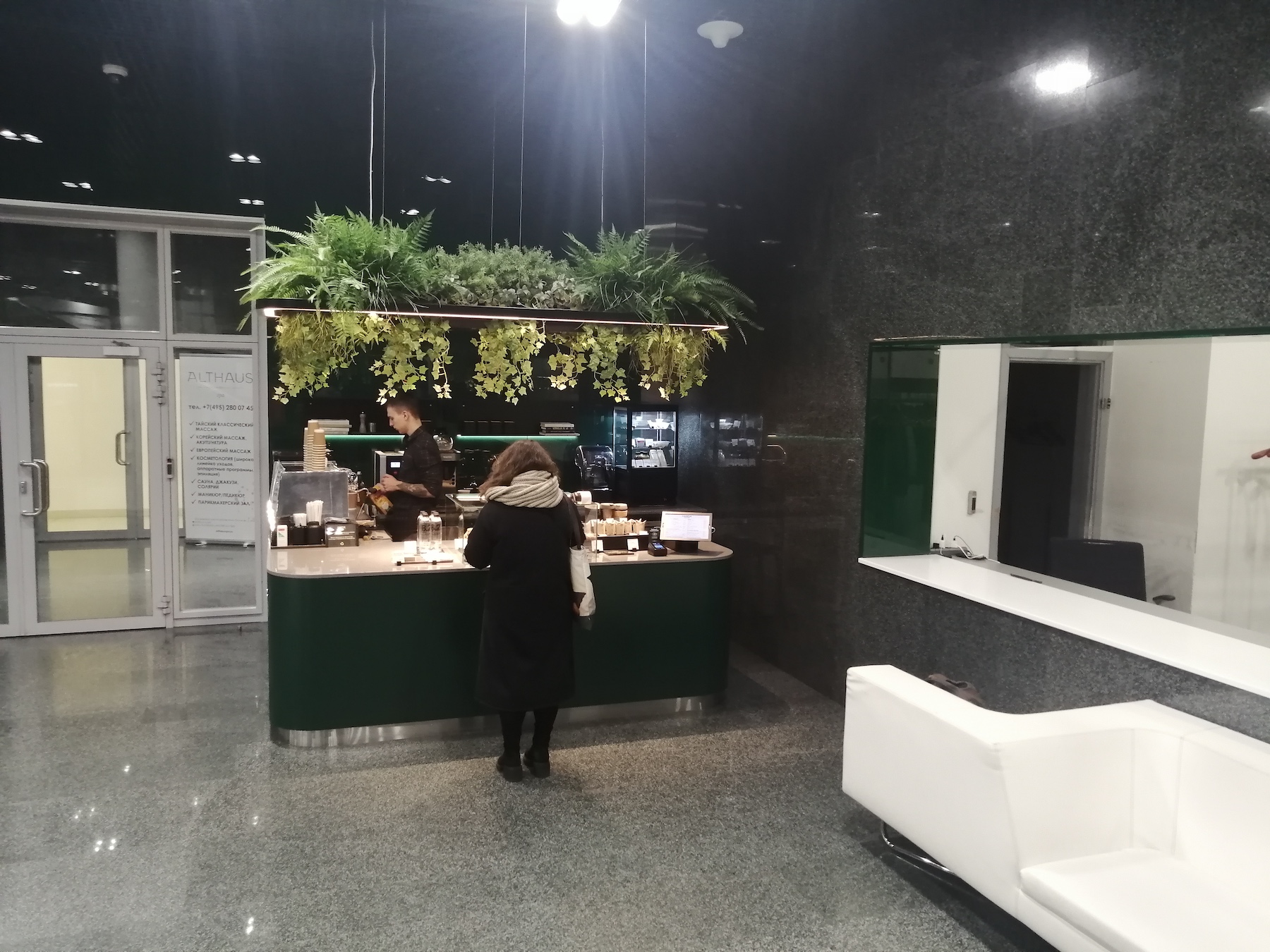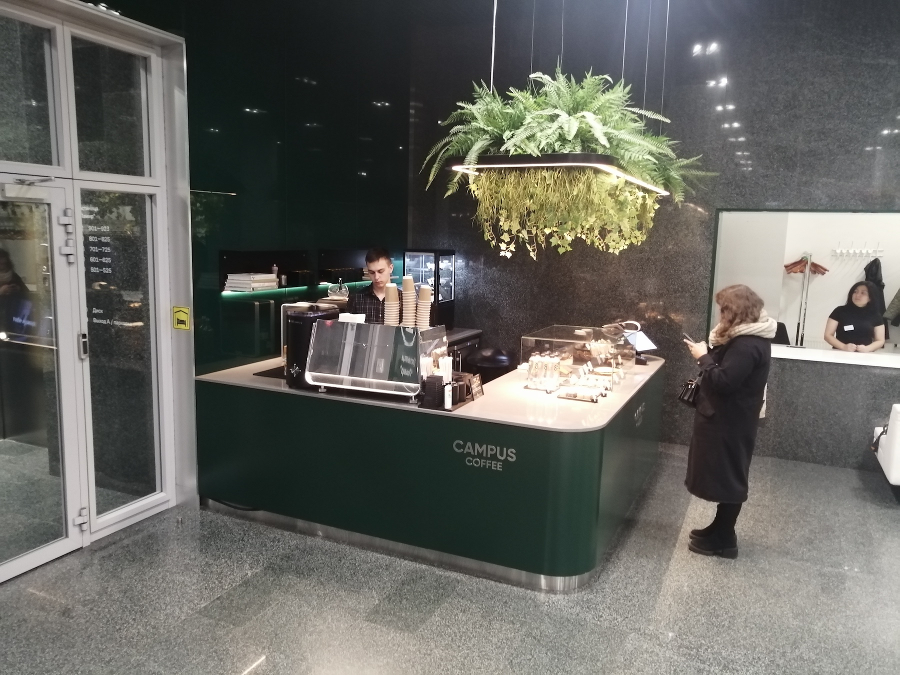 Сотрудники компании «Русский Проект» спроектировали и оснастили точку выдачи кофе. Совместно с дизайнерами были разработаны каркасные модули, которые в дальнейшем были обшиты фасадами.