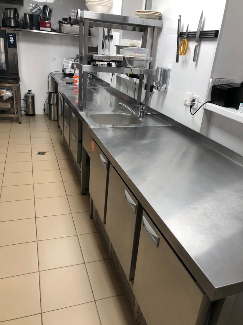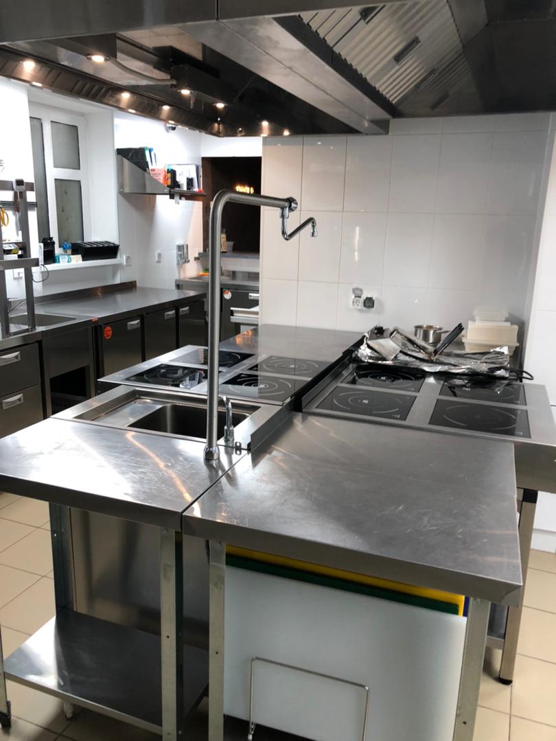 В соответствии с пожеланиями шеф-повара было смонтировано оборудование с высокой производительностью импортных и отечественных производителей: макароноварка KOGAST EKT-T47/V, пароконвектомат UNOX XEVC-0711-EPRM, плиты индукционные INDOKOR IN3500-4L с подставками, поверхность жарочная FIMAR FRY1L, гриль лавовый ROLLER GRILL 140D, миксер ROBOT COUPE MINI MP190 COMBI, гриль саламандра AIRHOT SGE-460, блендер VITAMIX DRINK MACHINE ADVANCE, мясорубка GASTROMIX MG-12SS, термоблендер TAURUS MYCOOK, аппарат упаковочный вакуумный INDOKOR IVP-400/2F, машина посудомоечная купольная ГРОДТОРГМАШ МПУ-700-01 со столами.