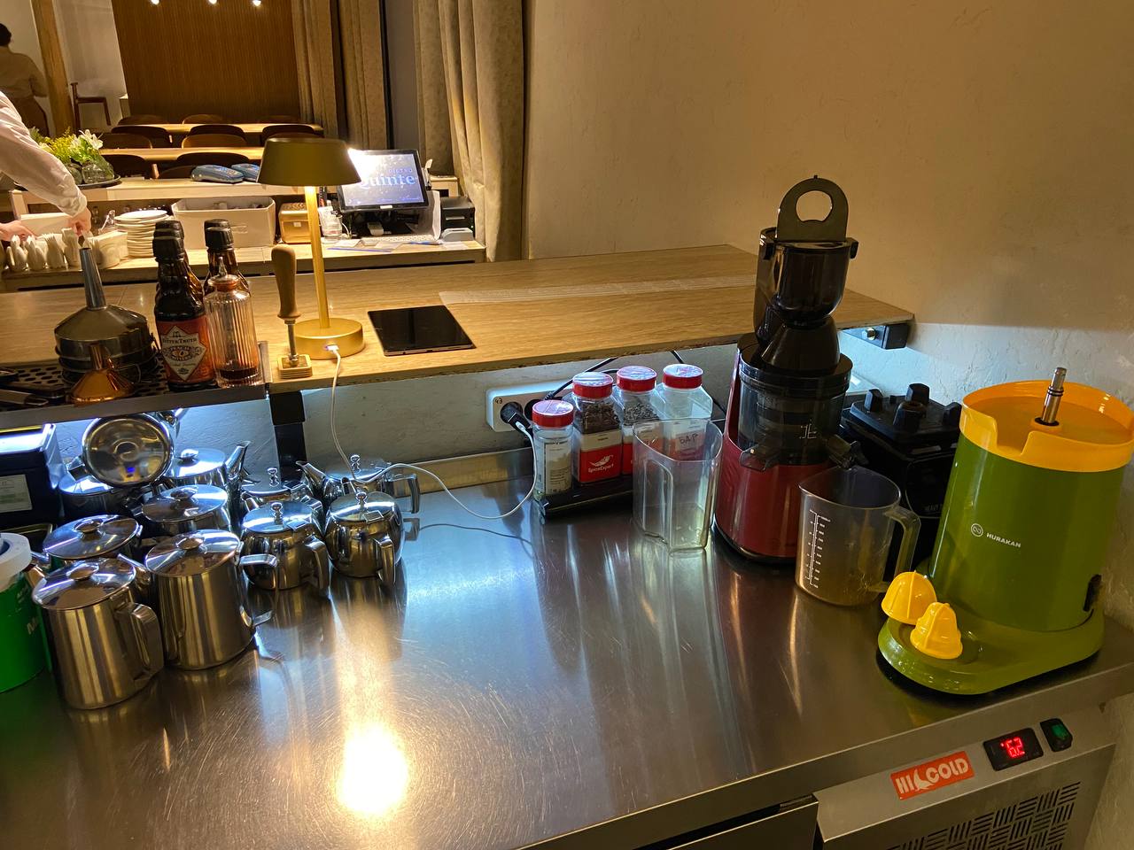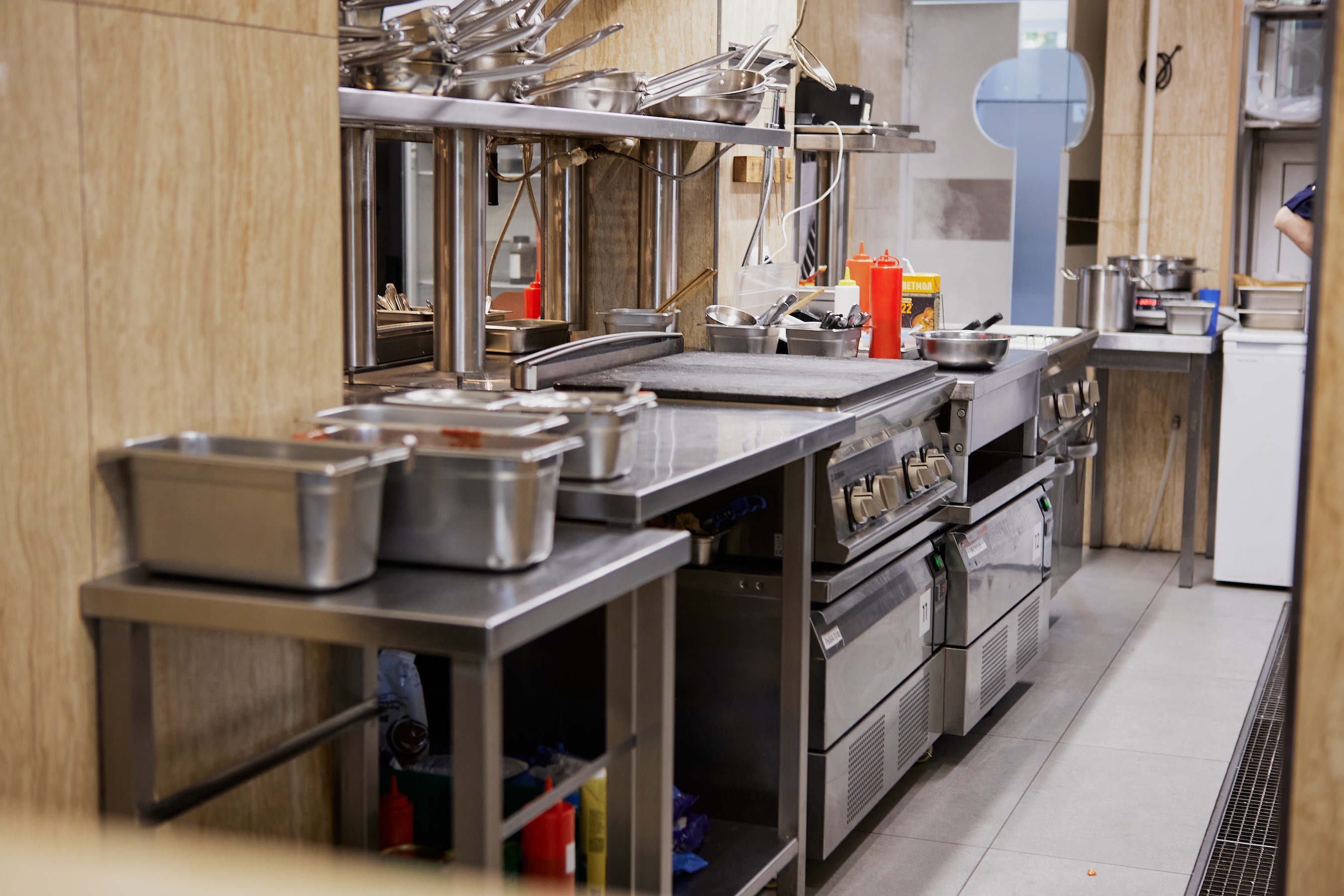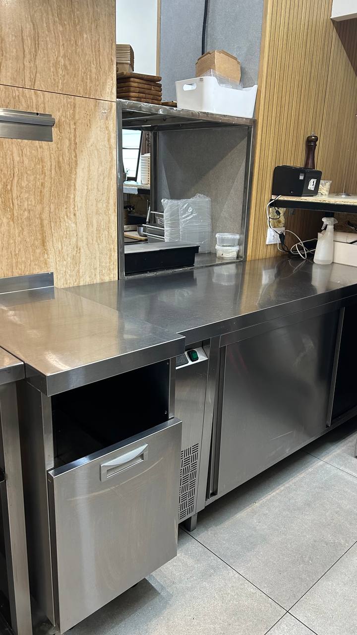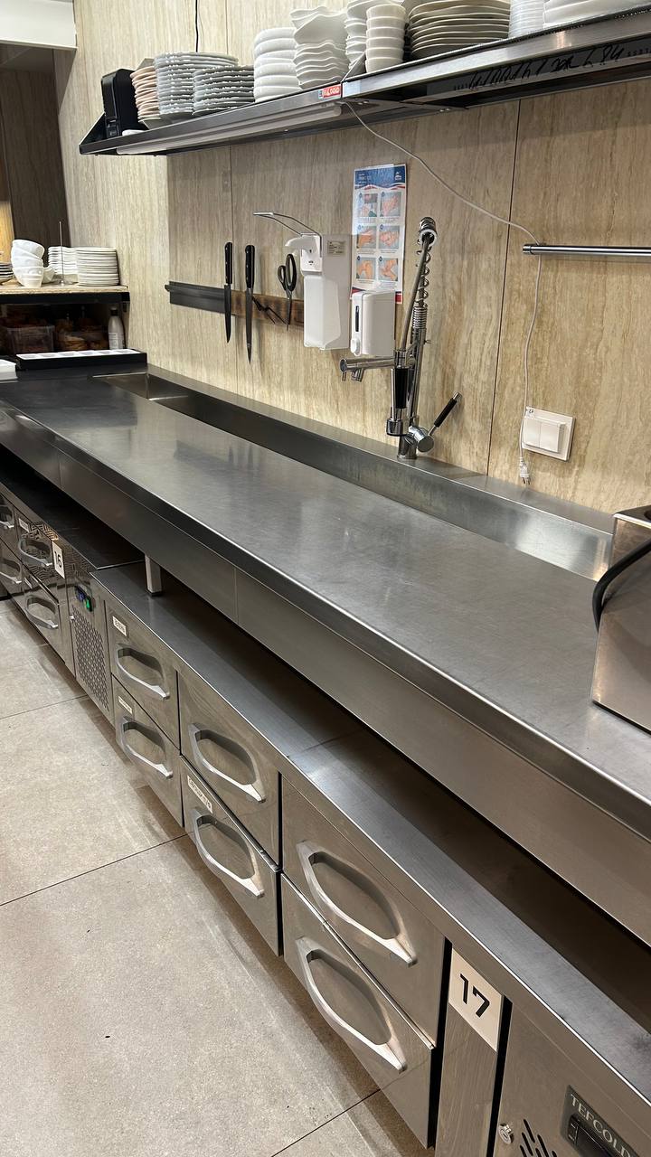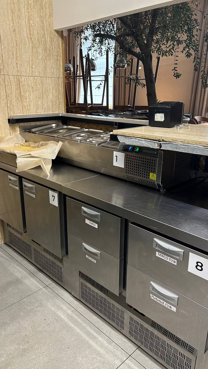 - Нестандартное нейтральное оборудование с встроенными узкими незаметными длинными пристенными мойками, чтобы увеличить рабочее пространство на столешницах, изготовленное по спецзаказу согласно пожеланий шеф-повара, по аналогии с ресторанным европейским оборудованием: полки со вставками между колоннами и столы-нейтрали с встроенными мойками установленные на низкие холодильные столы TEFCOLD на горячем острове и в холодном цехе.