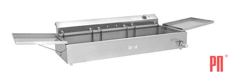 Фритюрница электриеская для чебуреков (чебуречница) настольная, с 1 ванной и 2 откидными крышками предназначена для приготовления пончиков, чебуреков, пирожков и других изделий (кроме продуктов с высоким пенообразованием, например картофеля) в большом количестве фритюра. Площадь поверхности фритюра - 2700см2. Длина с откинутой крышкой - 1655мм. Все детали фритюрницы, контактирующие с пищевыми продуктами, выполнены из пищевой нержавеющей стали. Фритюрница состоит из рабочей ванны и съемного нагревательного блока. К рабочей ванне, имеющей кран для слива остывшего фритюра, при помощи распорок присоединяются откидные крышки-полки, которые являются крышками при неработающей фритюрнице, а при работе - полками для готового продукта. Съемный нагревательный блок состоит из теплогенерирующего устройства (трех ТЭНов) и терморегулирующего устройства. На панели съемного нагревательного блока расположены ручка регулятора температуры и индикаторная лампа работы ТЭНов. Съемный нагревательный блок плотно устанавливается на борт рабочей ванны, противоположный сливному крану. Принцип работы фритюрницы основан на нагреве фритюра погруженными в него ТЭНами. Так как ТЭНы имеют значительную заделку электродов внутри трубок, ТЭНы нагреваются только в зоне, погруженной во фритюр. Поэтому в этой фритюрнице отсутствует эффект «бортовой полосы», приводящий к преждевременному окислению фритюра. Процесс жарки осуществляется при контакте поверхности приготавливаемого изделия (например, чебурека) с нагретым фритюром. При этом одновременно с теплообменом происходит процесс замещения влаги фритюром. Так как жарка происходит не погружным способом, продукты необходимо переворачивать для обжарки другой стороны. При жарке во фритюре создаются хорошие условия для теплообмена и обеспечивается равномерное образование корочки на всей поверхности продукта. В комплекте: вкладыш перфорированый 3шт., крышка-полка с распоркой 2шт.