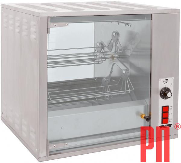 Гриль для кур электрический карусельный, с электромеханическим управлением, 1 камерой предназначен для для приготовления куры-гриль, а также иных мясных, рыбных и прочих полуфабрикатов. Гриль оснащен съёмным вертелом с 4 люльками-корзинами для приготовления 8 тушек весом 1.2-1.4кг. Корпус гриля изготовлен из нержавеющей стали, а распашная дверь и задняя стенка - из закаленного стекла. Внутри гриля расположены: съемный вертел с четырьмя люльками, четыре блока рефлекторов с нагревателями (два нижнего нагрева и два - верхнего), поддон для сбора жира. Для удобства уборки гриля по окончанию работы нижние рефлекторы выполнены съемными. Гриль оснащен приводом вращения вертела с автоматическим тормозом для предотвращения самопроизвольного проворота вертела при загрузке и выгрузке продукции. На лицевой панели размещены органы управления работой гриля: выключатели верхнего и нижнего нагрева, ручка регулятора температуры, выключатель привода вращения вертела. Принцип работы гриля основан на инфракрасном нагреве луфабрикатов, размещенных в люльках вертела. Время приготовления куры колеблется от 40 до 60 минут в зависимости от величины и жирности тушек. По окончании приготовления тушек, для поддержания продукта в теплом состоянии, можно отключить вверхние или нижние нагреватели. Если требуется укладка следующей партии кур, необходимо извлечь все тушки из предыдущей партии.