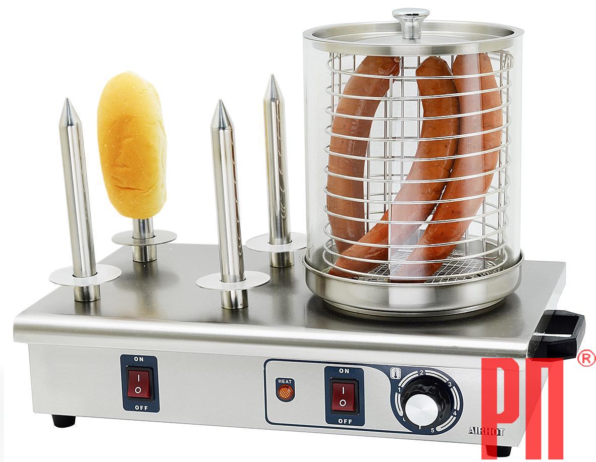 Аппарат для хот-догов AIRHOT HDS-04 оснащен стеклянной ёмкостью для приготовления сосисок и четырьмя штырями для подогрева булочек. Подходит для предприятий общественного питания и уличных точек.