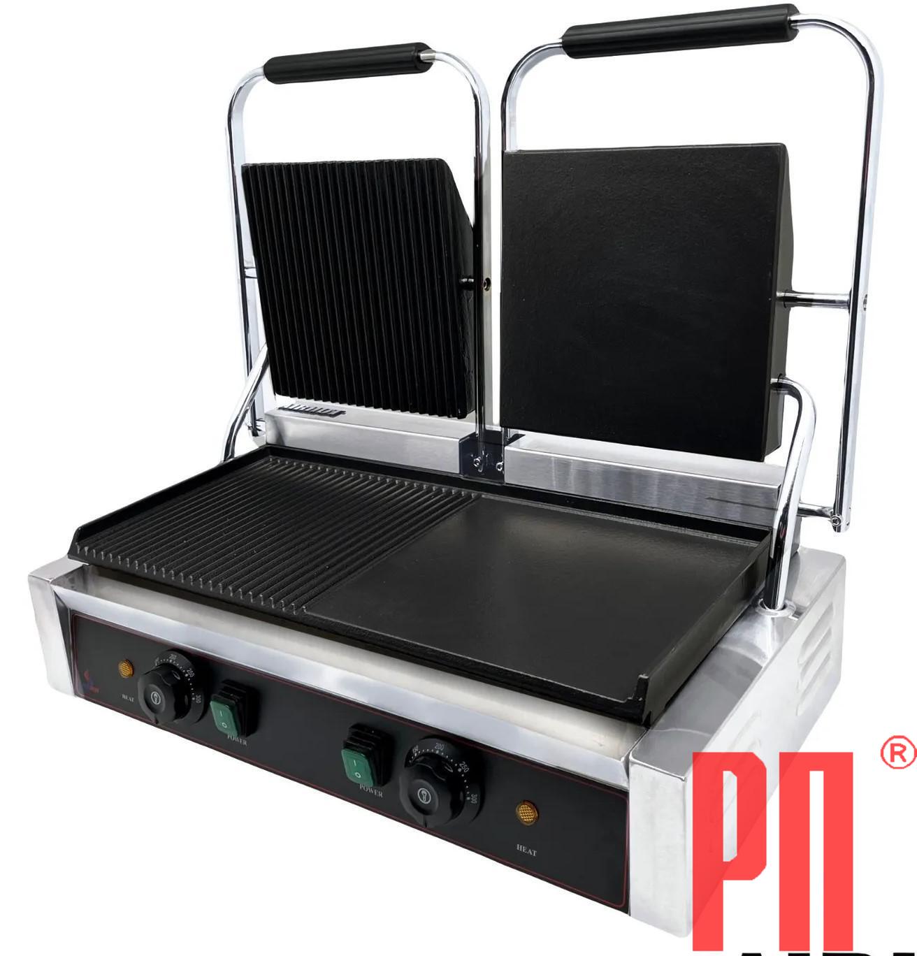 580x400x210мм, 3, 6 кВт, 220 В, двойной, одна половина - рельефный верх и низ, вторая - гладкий верх и гладкий низ, размер раб. поверх. из чугуна: верхние 215х215, низ 496х277 мм, темп. режим + 50/+ 300°С, съемный поддон, корпус из нерж. стали |