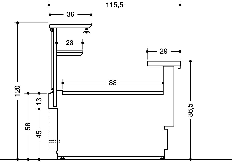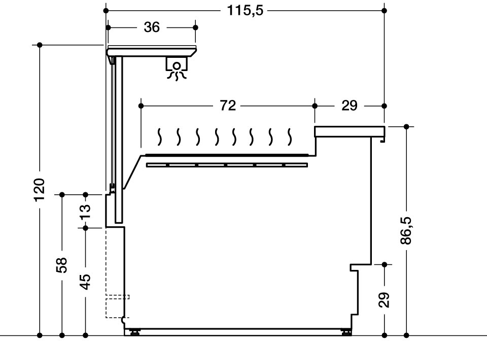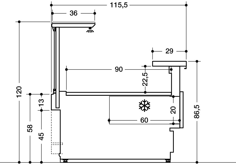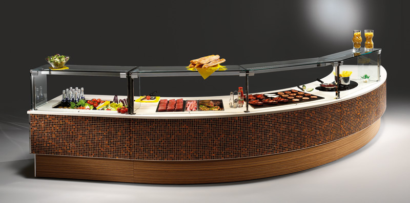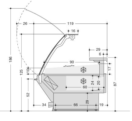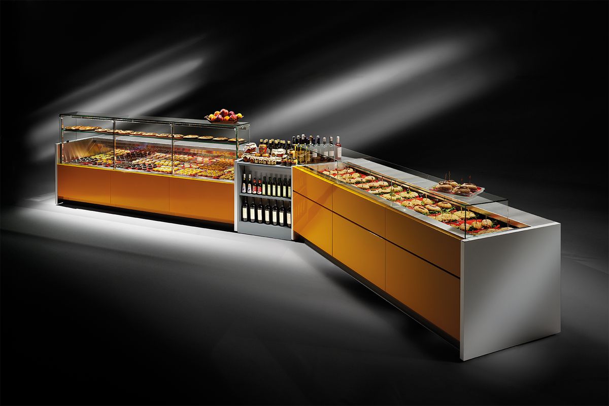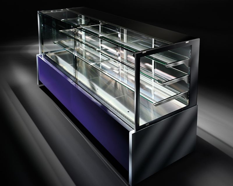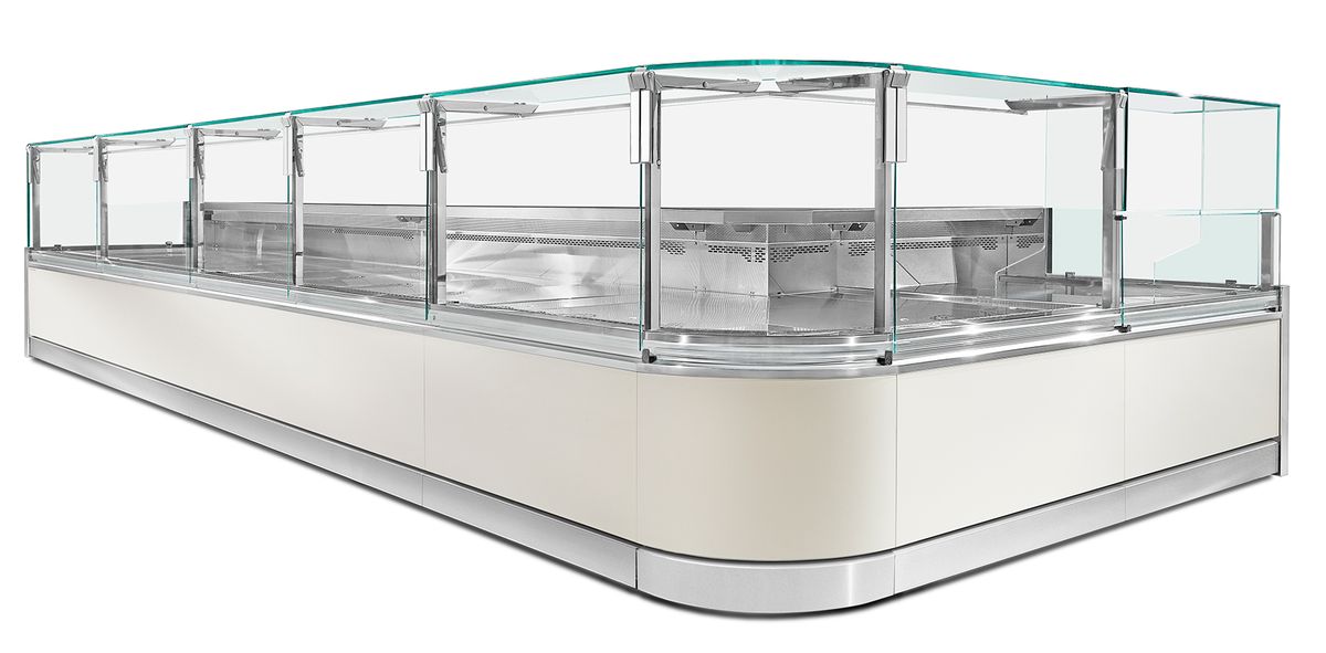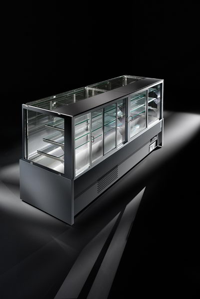 Современный дизайн прилавка ENIXE отличается лаконичностью формы и строгостью линий. Прямые вертикальные стекла и горизонтальная стеклянная полка отпуска обеспечивают максимальную обзорность продуктов. Фронтальные стекла поднимаются вверх и фиксируются при помощи гидролифтов.