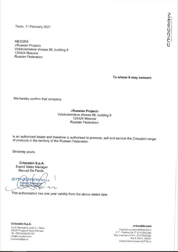 Компания Criocabin выпускает высококачественную продукцию в соответствии с индивидуальными требованиями потребителя: с любыми габаритами линейных витрин и угловых секций, дизайнерской отделкой в стиле интерьера заказчика и массой других возможностей.