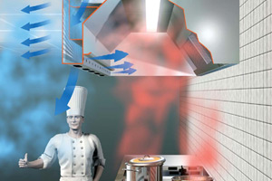 В общем и целом для удаления одного и того же количества избыточного тепла такая система требует расхода вытяжного воздуха на 30-40% меньше, чем традиционные вытяжные зонты.