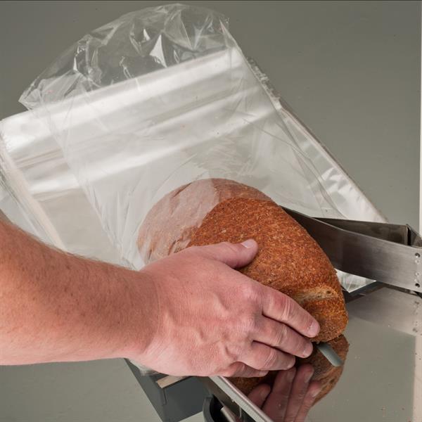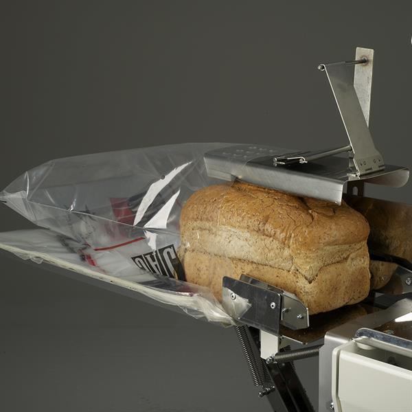- устройство для упаковки нарезанного хлеба в пакеты снабжено регулируемым ограничителем.