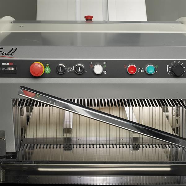 Автоматическая хлеборезка FULL работает по принципу непрерывной нарезки, благодаря своим механизированным загрузочным конвейерам (1 нижний ведущий - загрузочный конвейер ; 1 верхний ведущий - конвейер, регулирующийся по высоте, используется для прижимания хлеба и его продвижения к ножам). Данная машина позволяет нарезать самые разнообразные виды хлеба. Скорость подачи хлеба регулируется. Оптимальная эксплуатация хлеборезки FULL предполагает наличие двух операторов (1 на загрузке /1 на выгрузке–упаковке). В случае, если для работы с машиной будет задействован один человек, для увеличения производительности настоятельно рекомендуем дополнительно приобрести загрузочный конвейер.