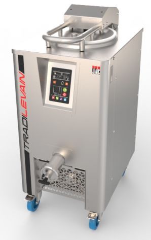 Tradilevain - это аппарат, который используется для того, чтобы с безукоризненной точностью производить и хранить жидкую закваску. С 3 различными объемами, он является новаторским по принципу действия. Смешивание происходит с помощью встроенного погружного винта, обеспечивающего гомогенность и стабильность массы. Данная система перемешивания не нуждается в чистке, поскольку сам шнек расположен в глубине емкости. Резервуар оснащен большой герметичной крышкой, препятствующей доступу кислорода (анаэробные условия), полностью открывающейся для удобства загрузки муки и горячей воды (45°). Выполненный целиком из нержавеющей стали, аппарат не требует особого ухода (нет необходимости в очистке cкребков или же лопастей смесителя). Холодильная установка позволяет контролировать температуру закваски во время различных производственных циклов. Аппарат оснащен выпускным клапаном с системой самоочистки.