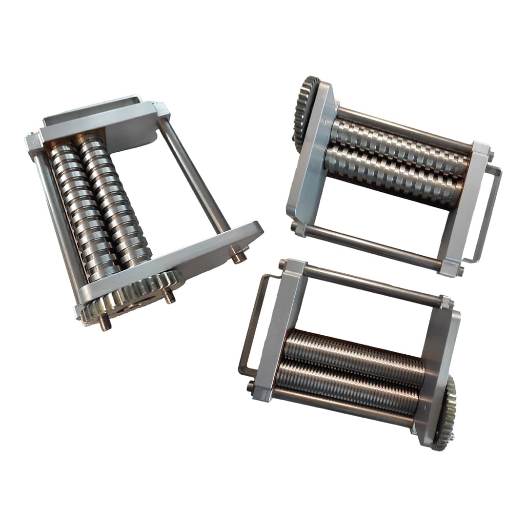 1. Насадка для приготовления лапши шириной 170 мм. Производит лапшу трёх различных форматов: тальолини (2 мм), тальателле (6 мм) и паппарделле (12 мм). 2. Насадка для приготовления равиоли позволяет приготовить равиоли, склееные друг с другом, различного формата и с пастообразной начинкой (мясо, сыр, овощи и т.д.) 3. Насадка - экструдер производит все виды экструдированных макаронных изделий. Можно приобрести либо бронзовые матрицы (получаются макароны с более шершавой поверхностью), либо тефлоновые матрицы (получаются макароны с более гладкой поверхностью). В комплект входит нож для автоматического обрезания коротких макаронных изделий. 4. Насадка для приготовления «ньокки» позволяет готовить картофельные или мучные ньокки различного размера. К тесту можно добавить помидоры или шпинат.