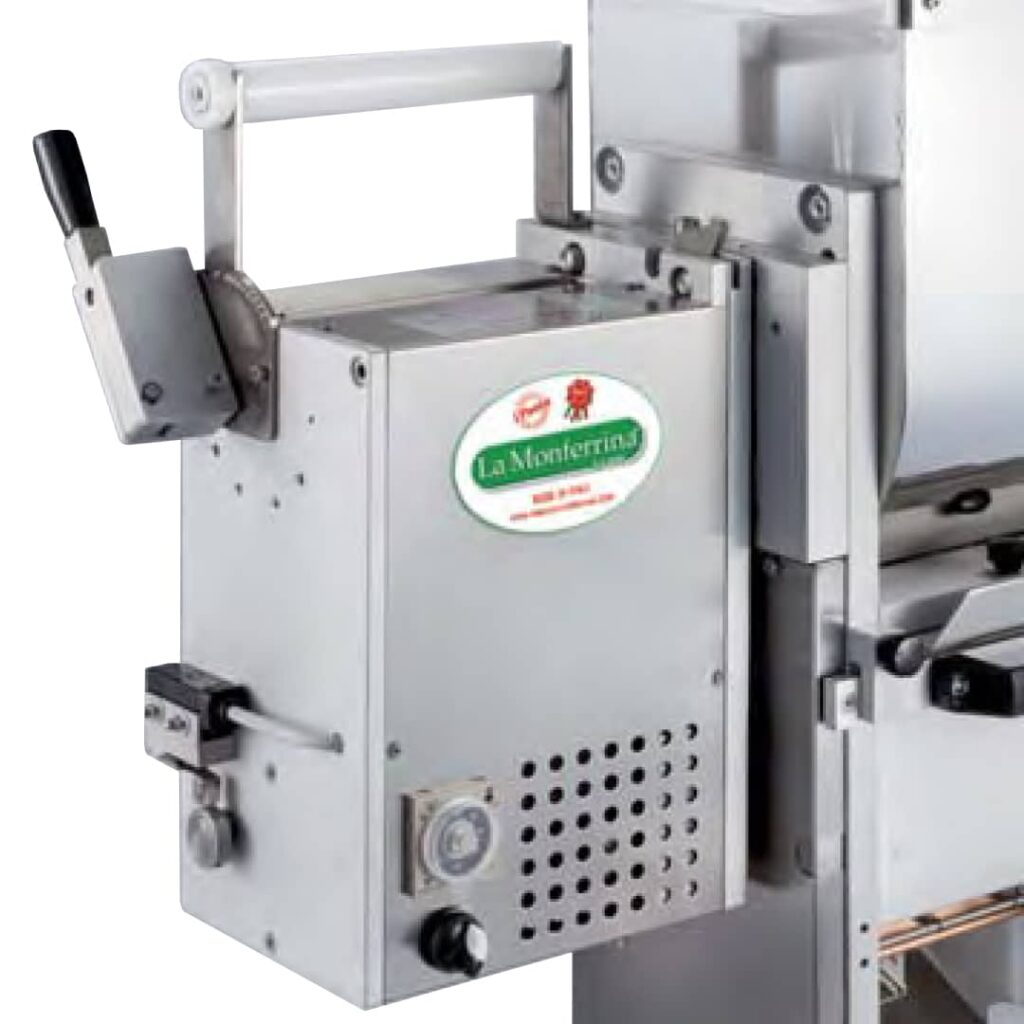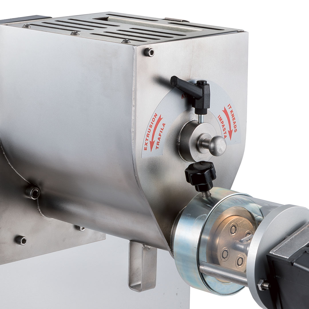 PIDUE с экструдером является автоматической тестораскаточной машиной с двумя тестомесами: верхний тестомес оснащен головкой для экструдирования всех видов макаронных изделий, меняя матрицу. Можно приобрести либо бронзовые матрицы (получаются макароны с более шершавой поверхностью), либо тефлоновые матрицы (получаются макароны с более гладкой поверхностью).