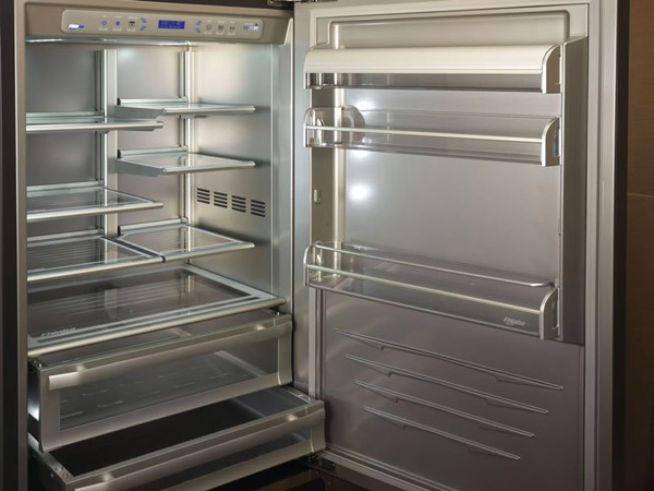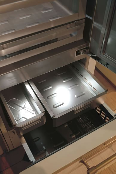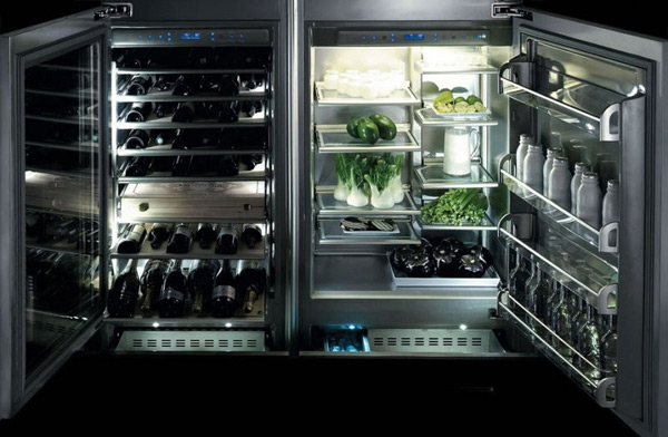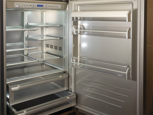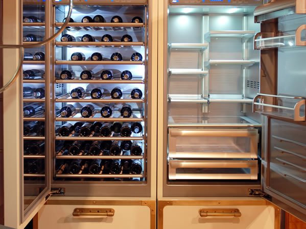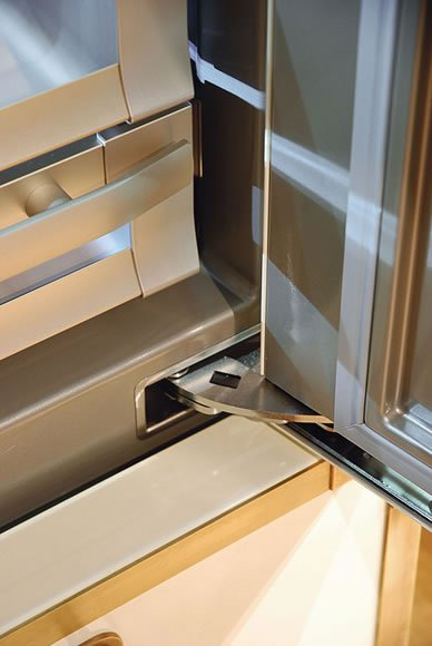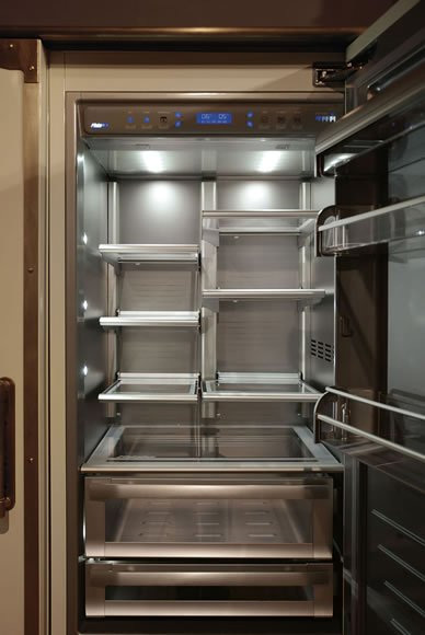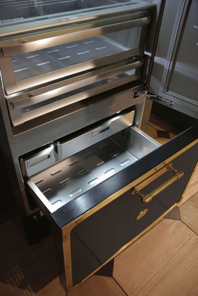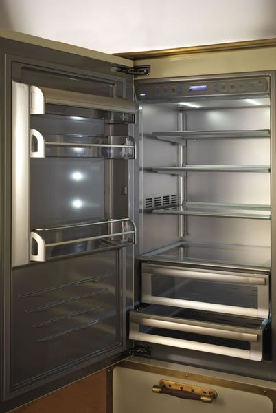 Корпус холодильника выполнен из толстой нержавеющей стали, окрашен и отделан вороненой или никелированной латунью, тем самым прекрасно сочетаясь с отделкой кухонь.