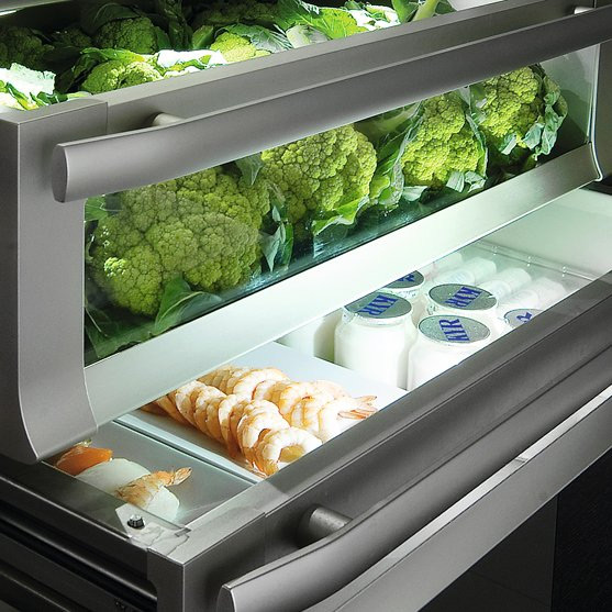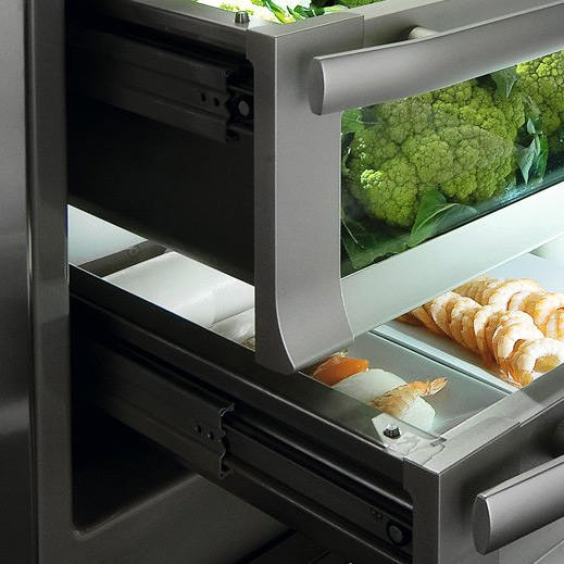 - 2 "Low Temp" ящика: два вместительных ящика, выполненных из нержавеющей стали, стекла и алюминия гарантируют нулевую температуру и контроль влажности для оптимального хранения свежих продуктов.