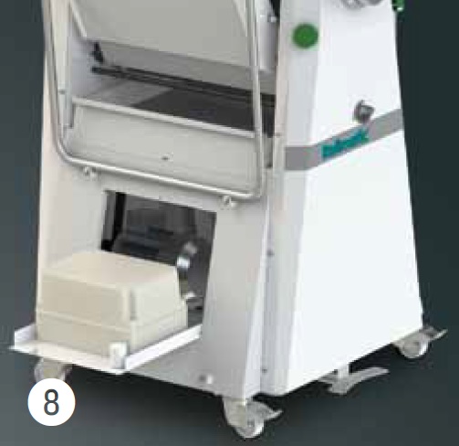 Разрабатоны в соответствии с последними регламентами безопасности CEE (EN1674). Напольная тестораскаточная машина с основой на колёсах с шириной ленты 600мм. Столы складные и съёмные. Реверсирование направления движения выполняется посредством рычага и педали, защитные покрытия цилиндров оборудованы микровыключателем безопасности и газовой пружиной. Доступна в версиях с 1-ой скоростью или с инвертором, с системой нарезки или без нее.