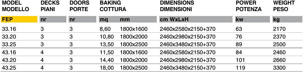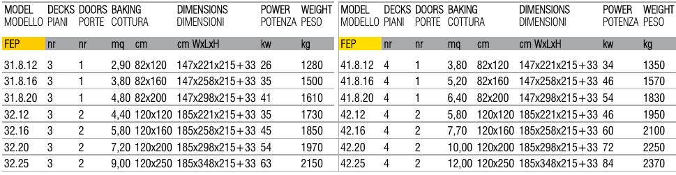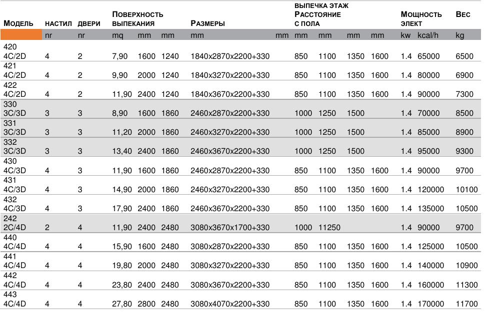 Модель | Полезная ширина дверей | Полезная глубина пода, мм | Площадь выпечки, м² | Габариты,мм со столом | Размер (Ш) с кирпичной отделкой | Электрическая мощность, кВт при 400В | Масса нетто, кг | Масса нетто, кг с кирпичной отделкой |