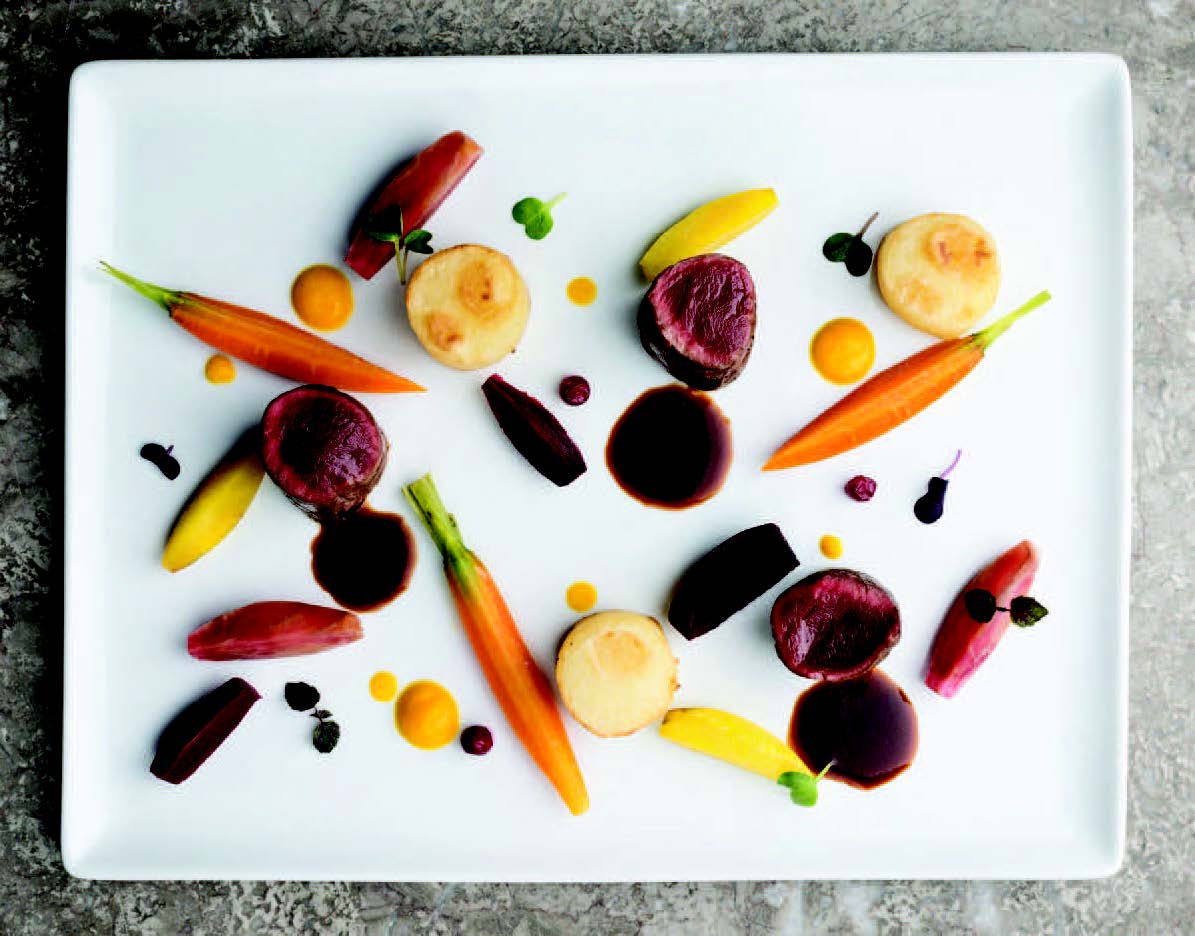 Филе северного оленя с соусом из черного шоколада и красным вином, клубнями и брусникой