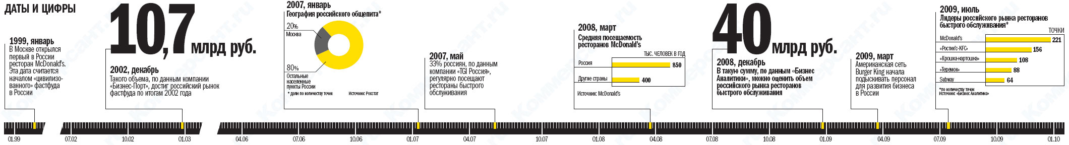 Локомотив российского рынка фастфуда McDonald's (221 ресторан) отчитался, что в мае 2009 года рост продаж в Европе составил 7,6% по сравнению с прошлогодним маем, а Россия показала один из лучших результатов. Точные данные по стране, правда, не раскрываются. «В последние шесть месяцев наши доходы увеличились примерно на 10% по сравнению с аналогичным периодом прошлого года»,— говорит президент «Ростик'c—KFC» Ник Глушко. Словом, в кризис фастфуду не пришлось сильно втягивать живот.