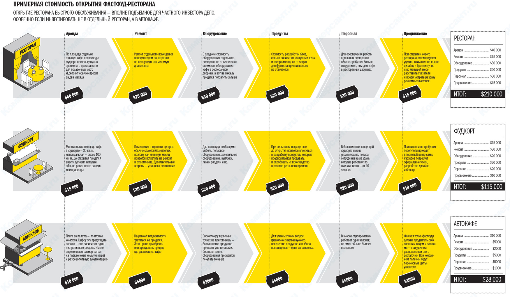 Это объяснимо. На открытие ресторана в торговом центре нужно относительно немного — от $100 тыс., уличного киоска — от $20 тыс. При этом первый может окупиться за два-три года, второй — уже за полгода. Люди, раньше предпочитавшие вкладывать свободные средства в недвижимость или фондовый рынок, решили, что заработок на хлебе насущном по нынешним временам надежнее. Главное — выбрать удачную концепцию.