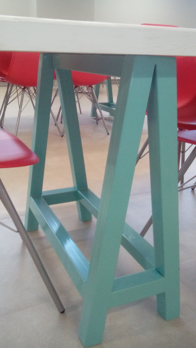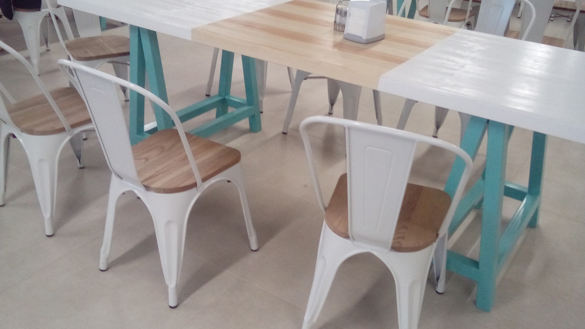 Холод металла в отделке потолка, лестниц и элементах линии раздачи сглажен теплом дерева столешниц, выполненных из массива сосны. Древесина на мебельной фабрике T&T была браширована под покрытие водостойким лаком. Такая технология обработки дерева сложная и трудоёмкая, но в результате мы получаем фактурную природную поверхность. Металлические подстолья цвета морской волны были выполнены эксклюзивно по специальным чертежам дизайнера и покрашены порошковой краской по RAL. Такое сочетание задает тон изысканной уникальности.